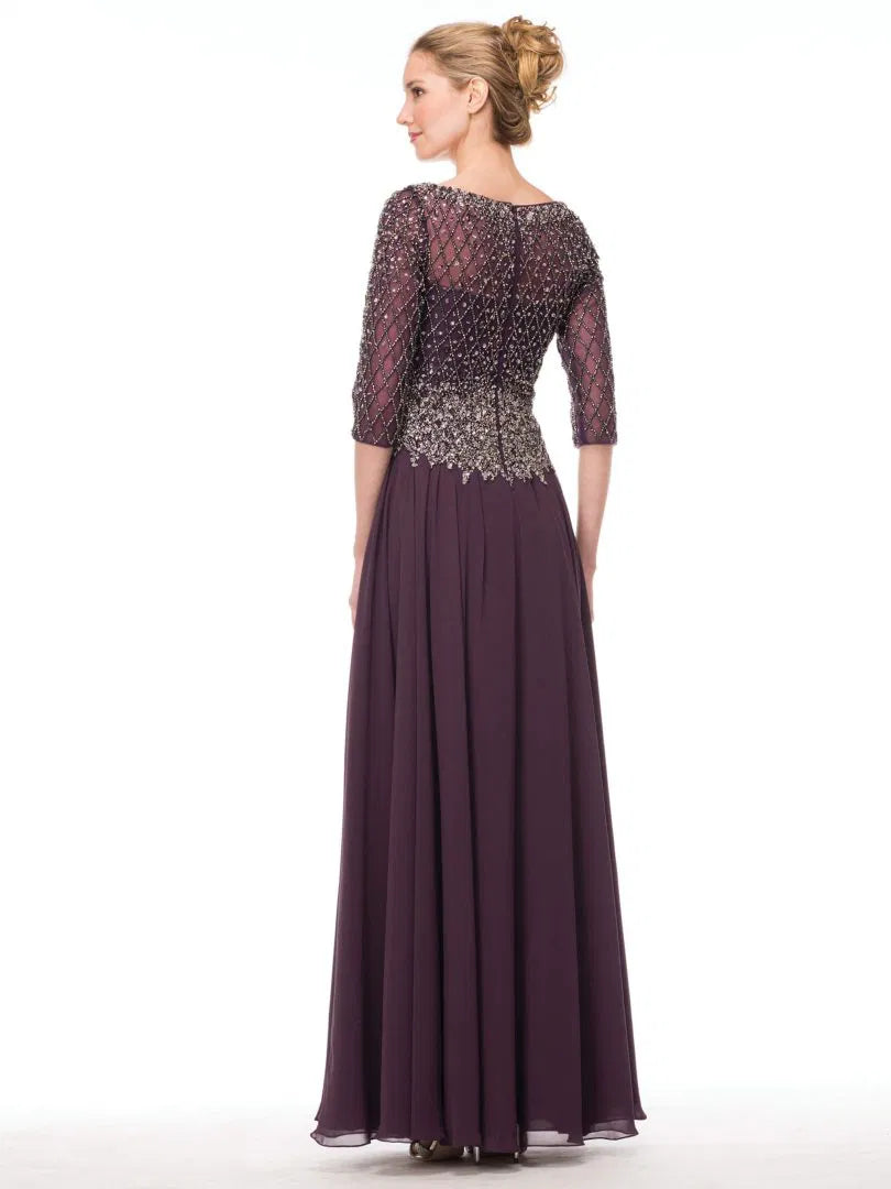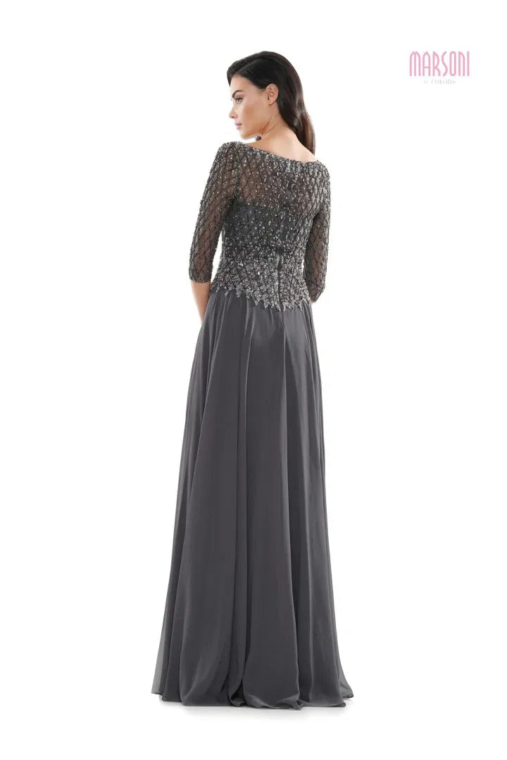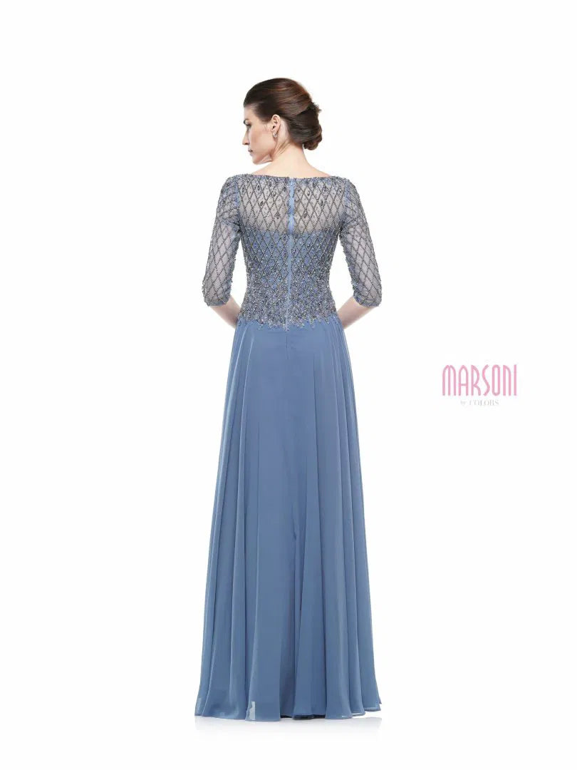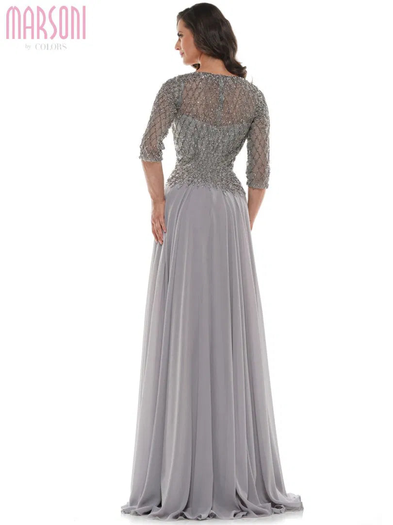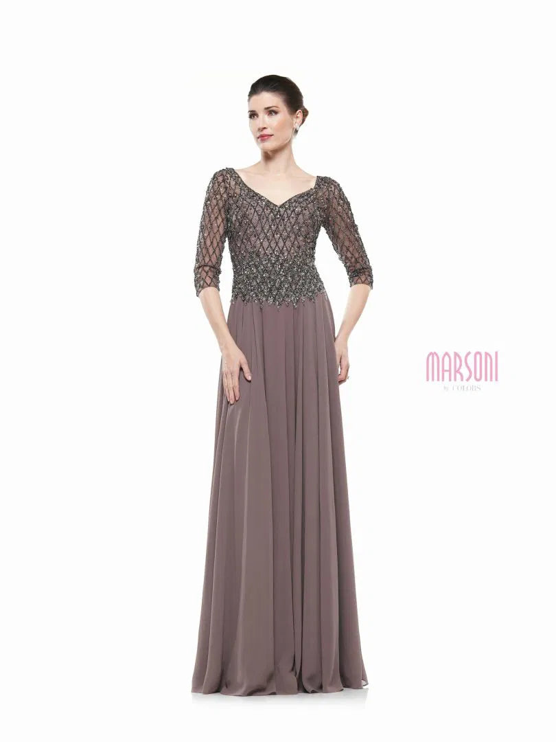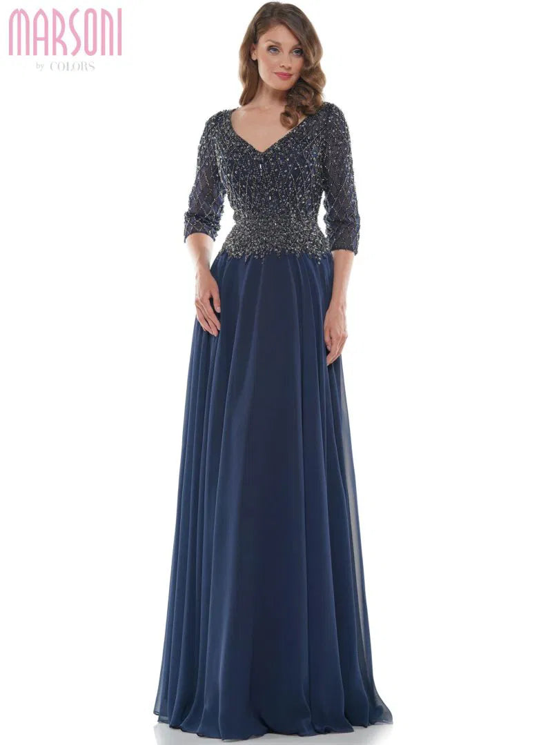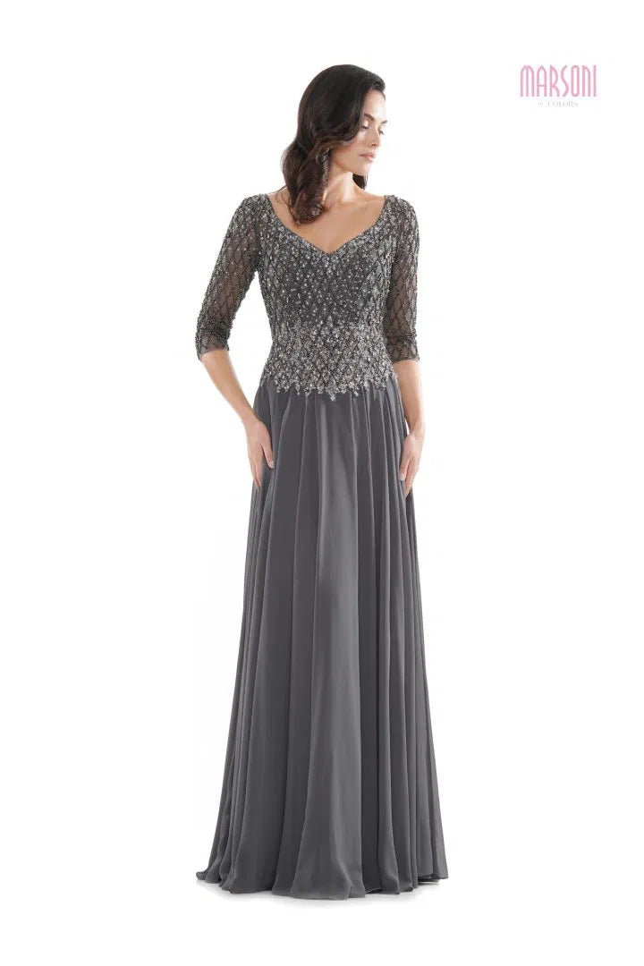 Marsoni M165 features a V-neckline with a fitted bodice adorned in intricate beaded embroidery for an elegant, refined look. A flowing chiffon A-line skirt adds graceful movement and comfort. Perfect for formal weddings and sophisticated evening events.