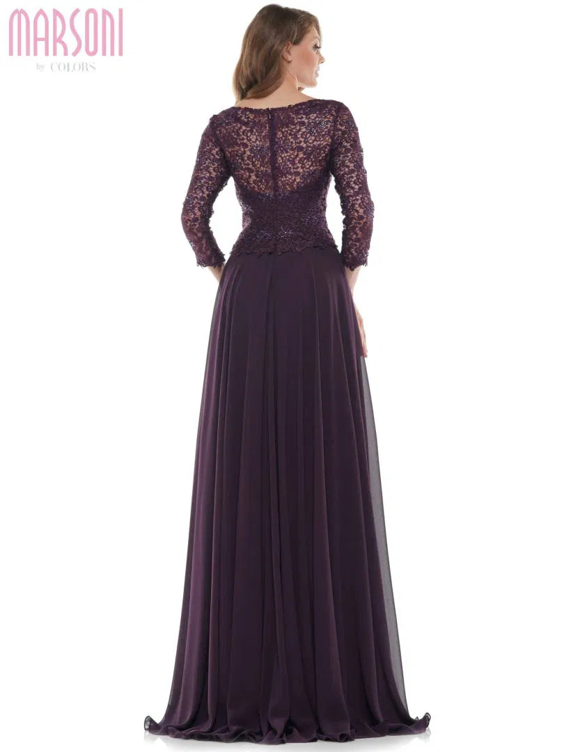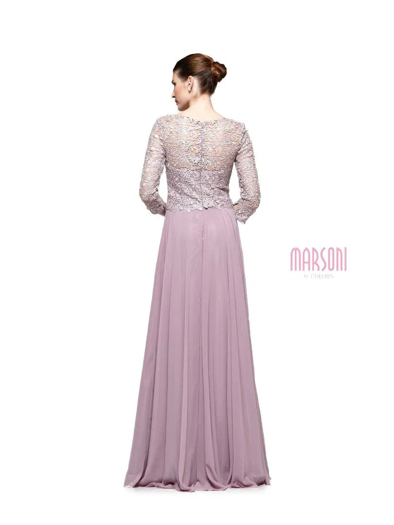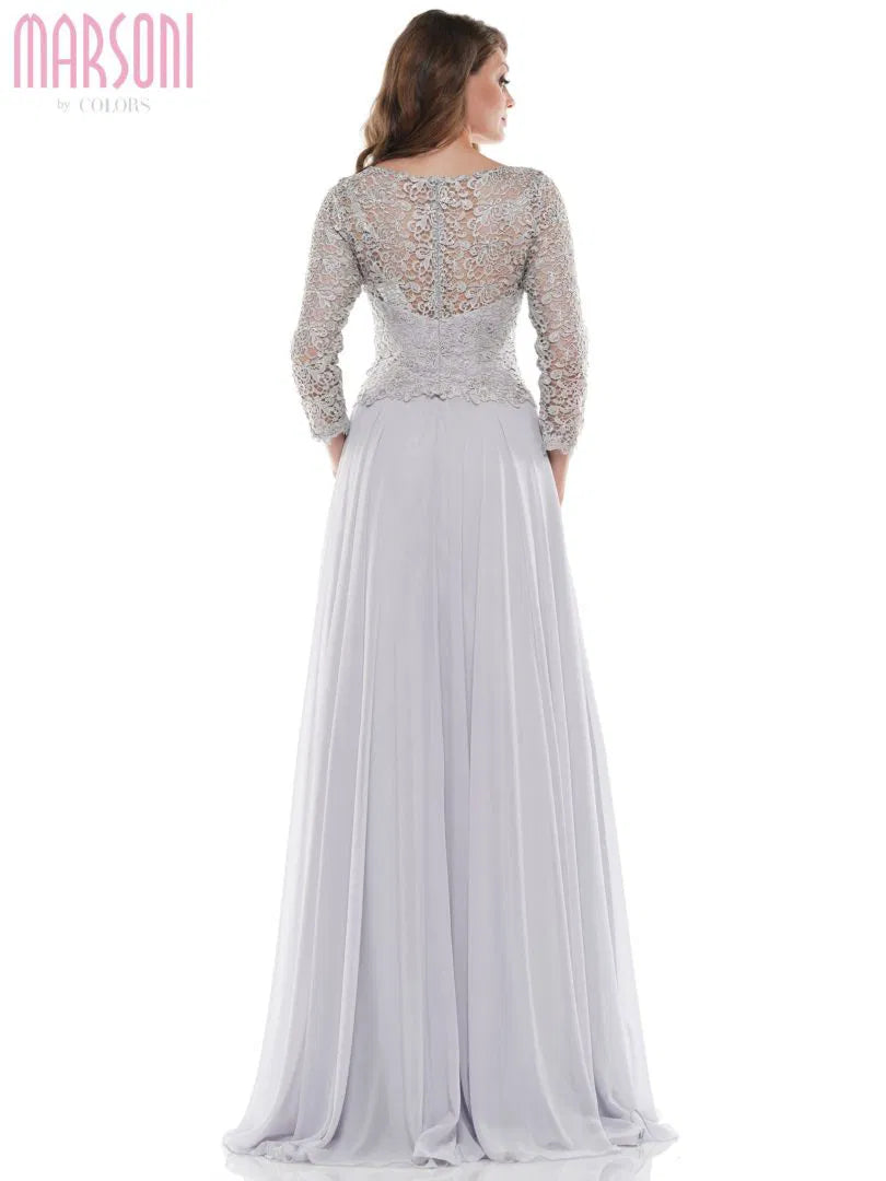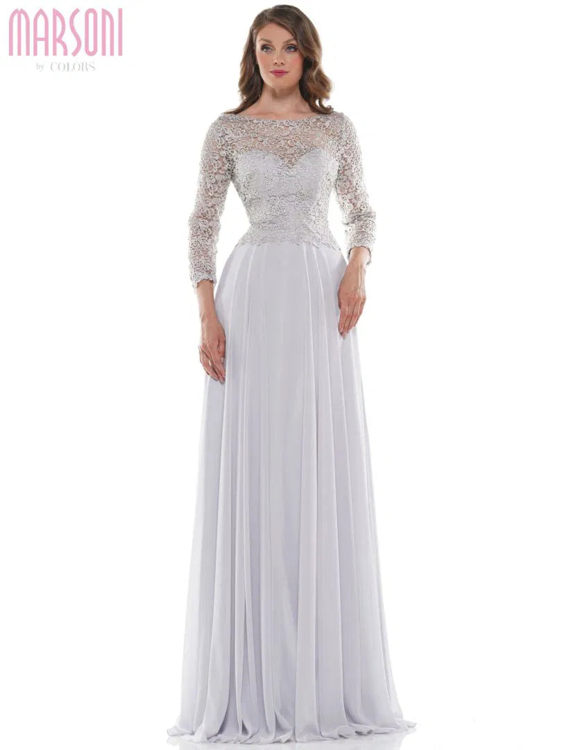 Marsoni M223 features a bateau neckline with a fitted lace bodice adorned in delicate embroidery for a soft, romantic look. A flowing chiffon A-line skirt adds graceful movement and effortless elegance. Perfect for formal weddings and refined evening celebrations.