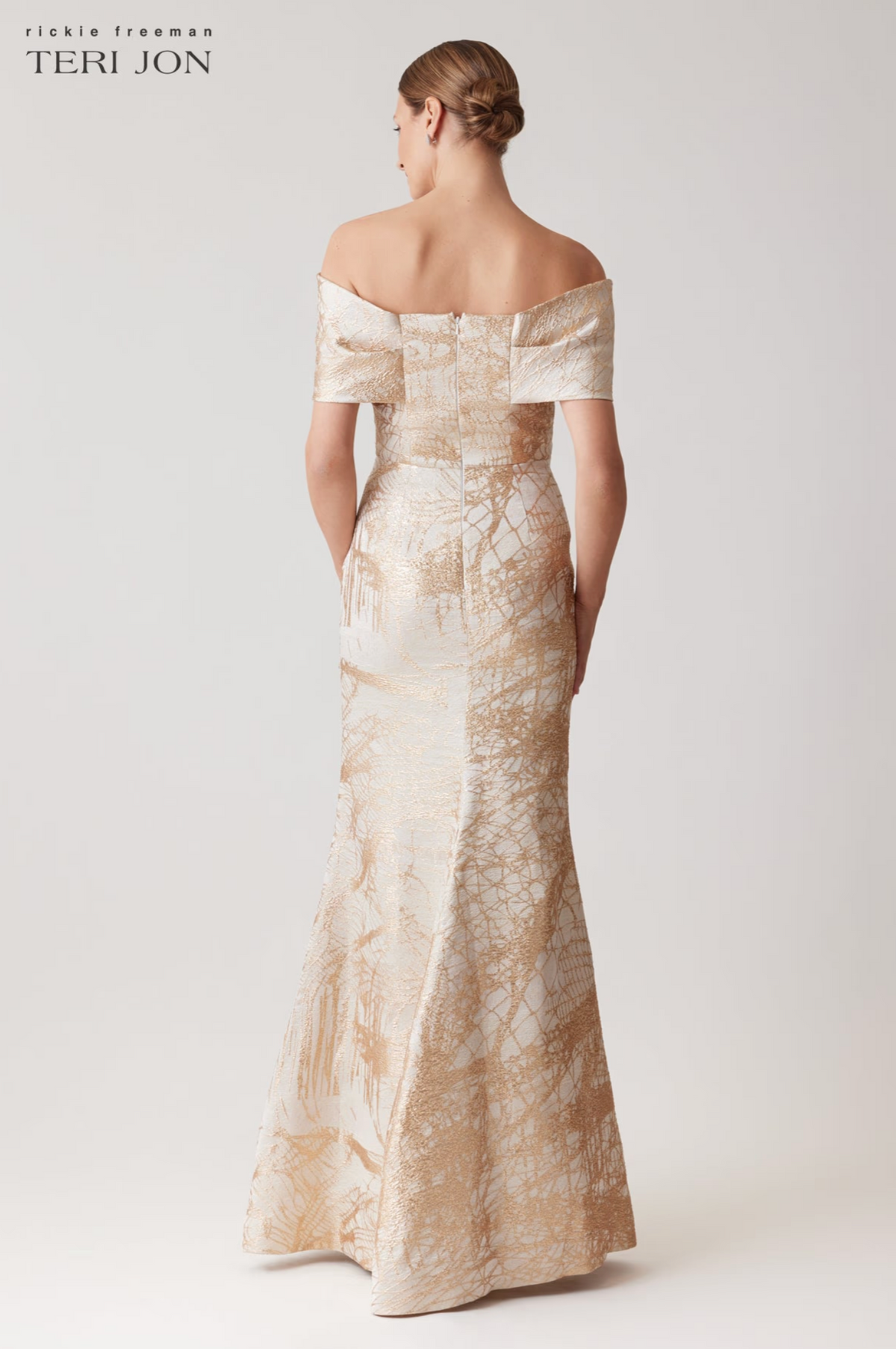 Crafted in a shimmering gold jacquard, this gown features an elegant off-the-shoulder neckline with a sophisticated twist detail. The mermaid silhouette hugs the body beautifully before flaring into a graceful hem. An ideal choice for formal weddings, galas, or evening soirées.
