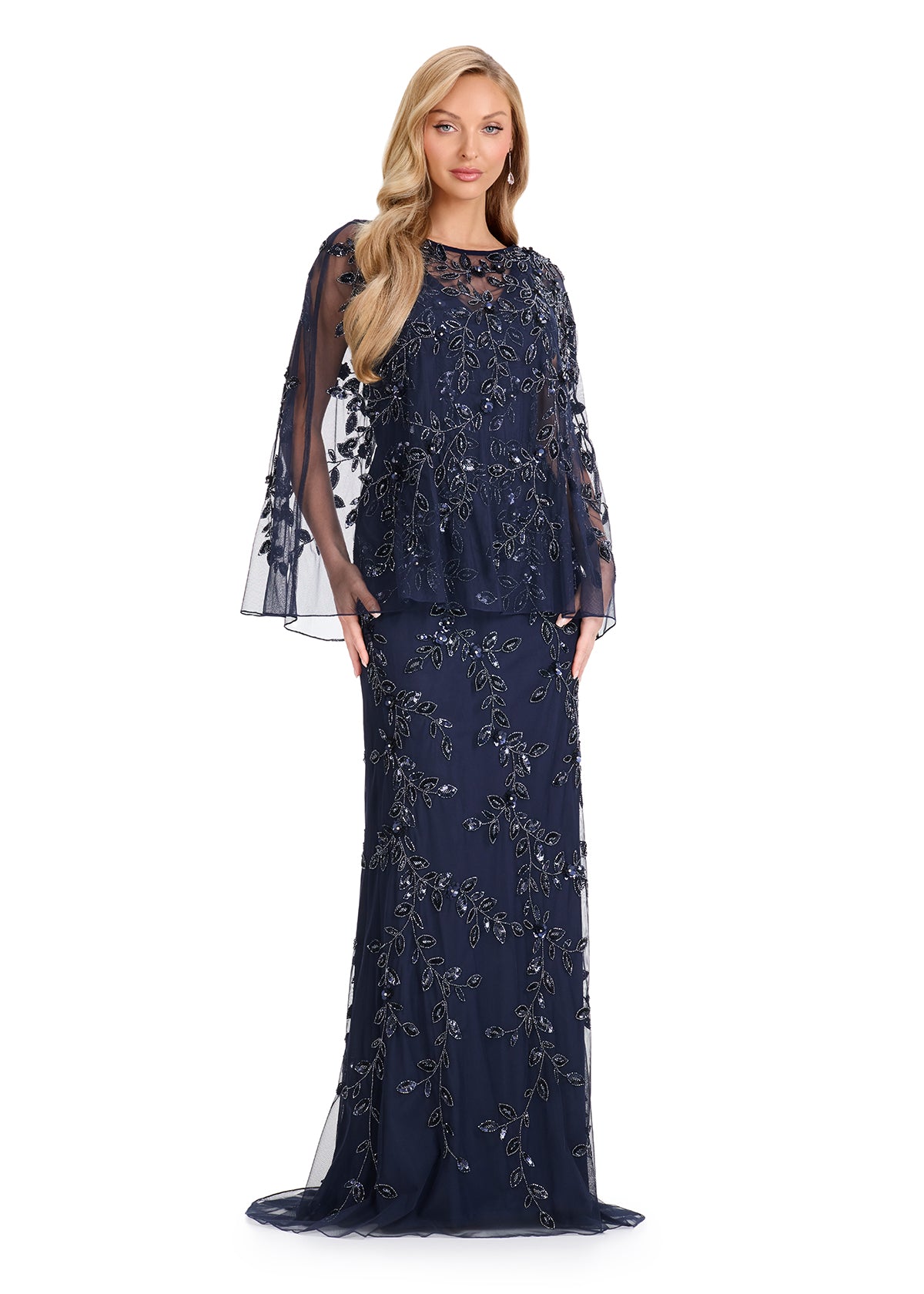 Ashley Lauren E12095 offers refined elegance with intricate detailing. This long-sleeve dress features a sheer overlay adorned with delicate leaf embroidery. The relaxed top flows effortlessly into a sleek, floor-length skirt. Designed for formal occasions, this dress blends timeless sophistication with graceful movement, perfect for evening events.