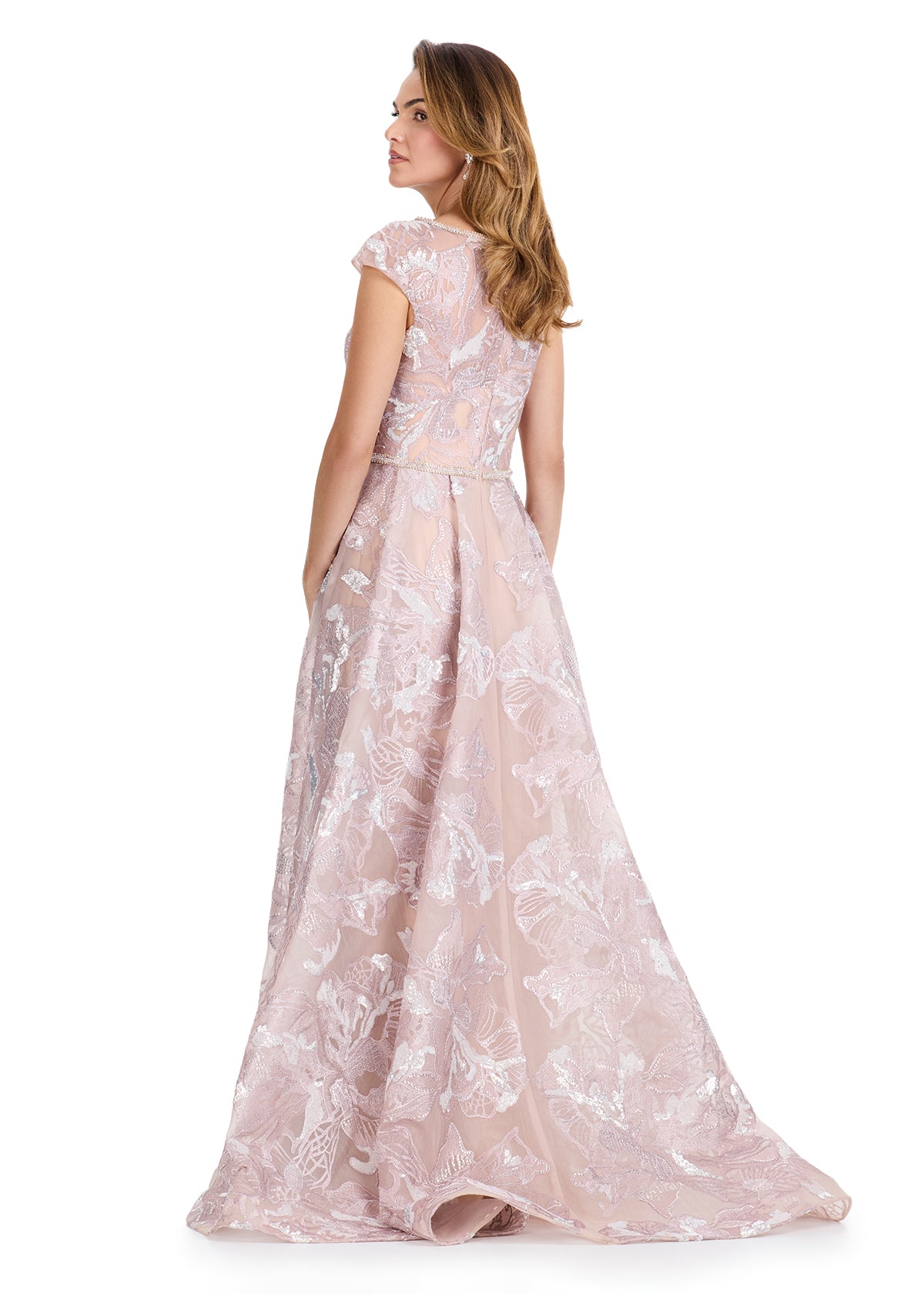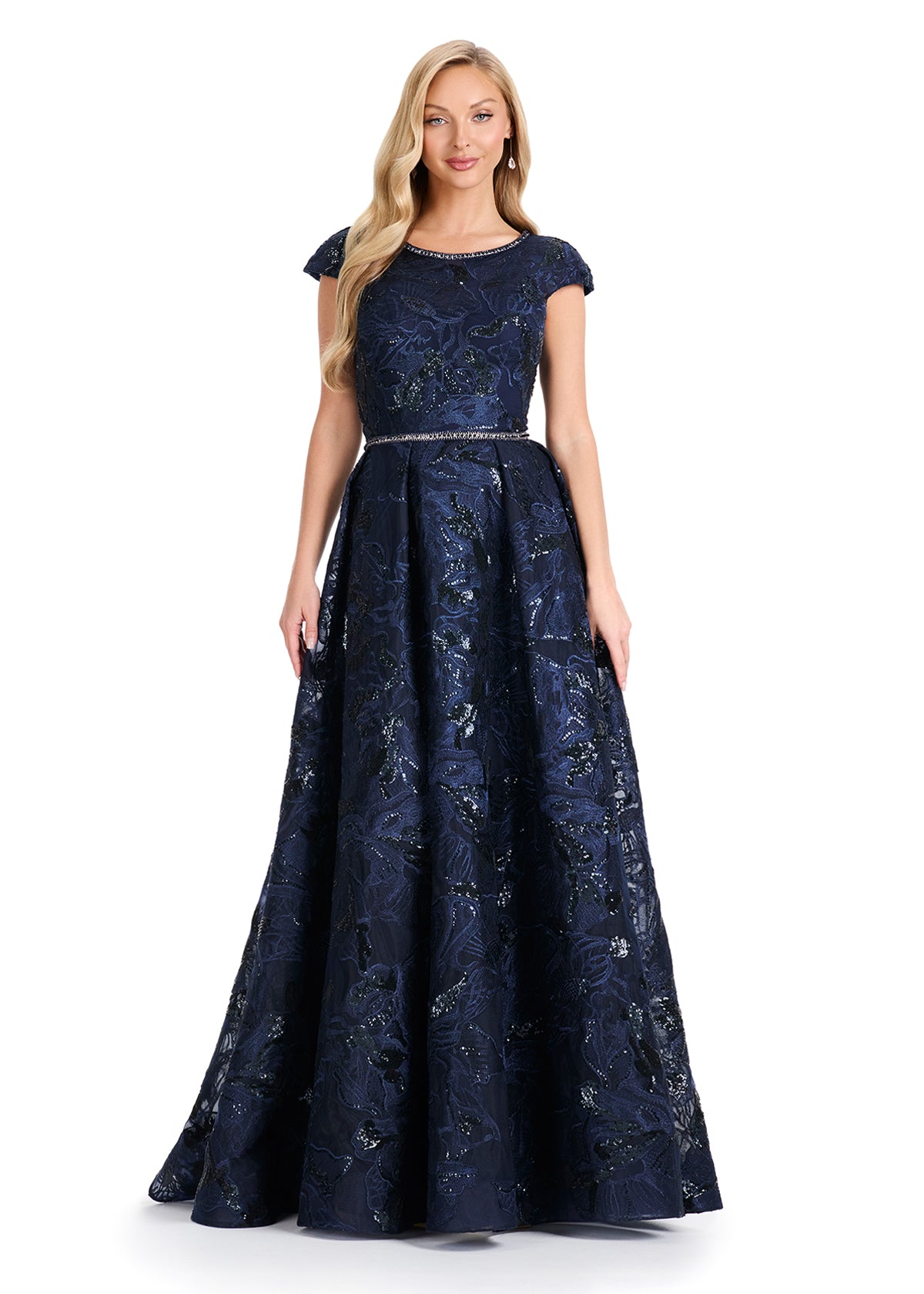 Ashley Lauren E12100 captures timeless elegance with its cap sleeve bodice and intricately textured overlay. Featuring a softly contoured waist and a flowing full-length skirt, this dress is ideal for formal celebrations and evening events.