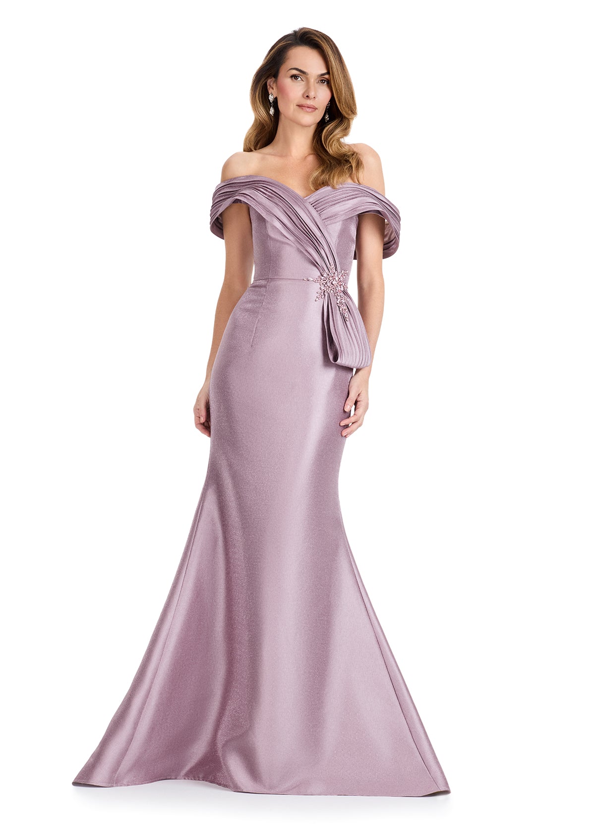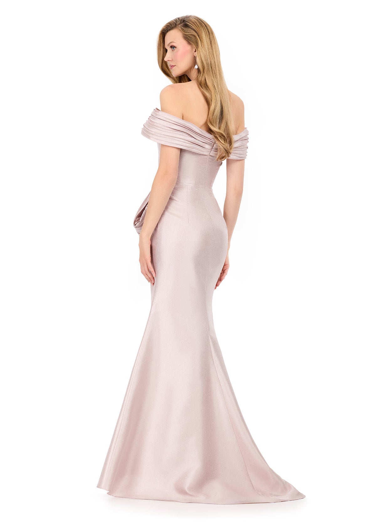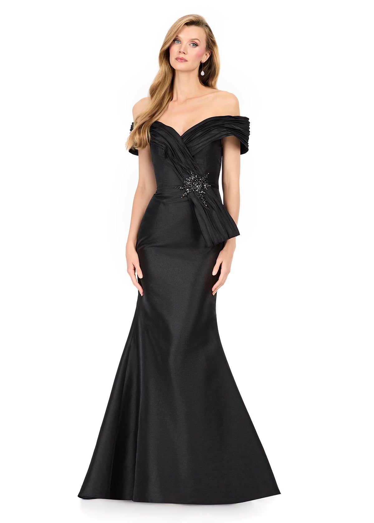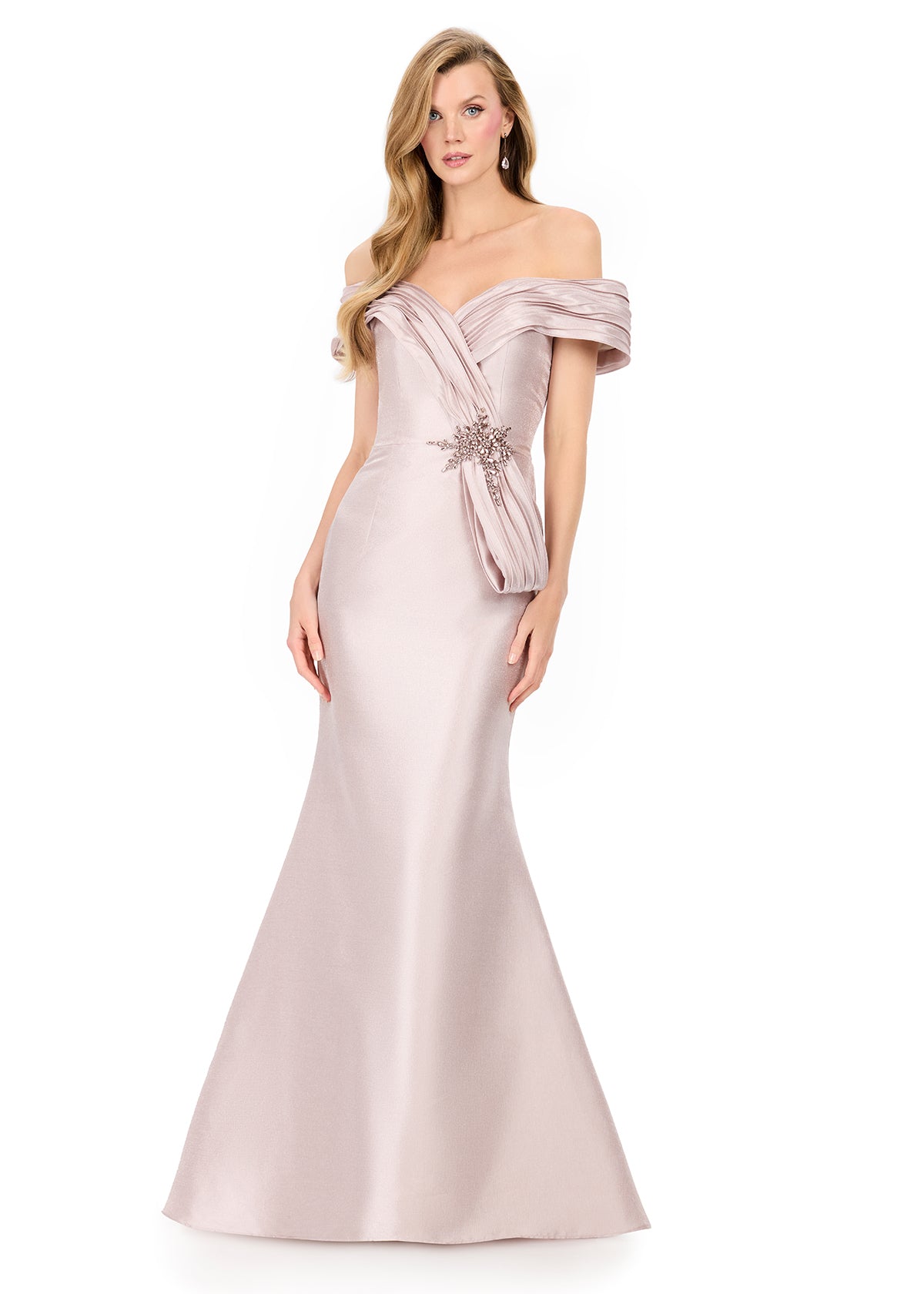 Ashley Lauren E12103 showcases an elegant off-the-shoulder neckline with softly layered pleating across the bodice. A beautifully detailed accent at the waist adds dimension while enhancing the figure. Designed with a sleek, floor-length silhouette, this refined dress offers timeless sophistication and graceful movement, making it ideal for formal occasions and special events.