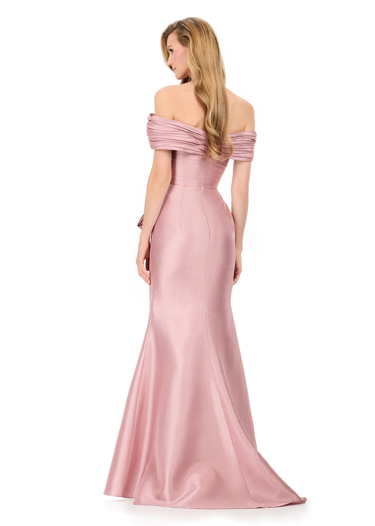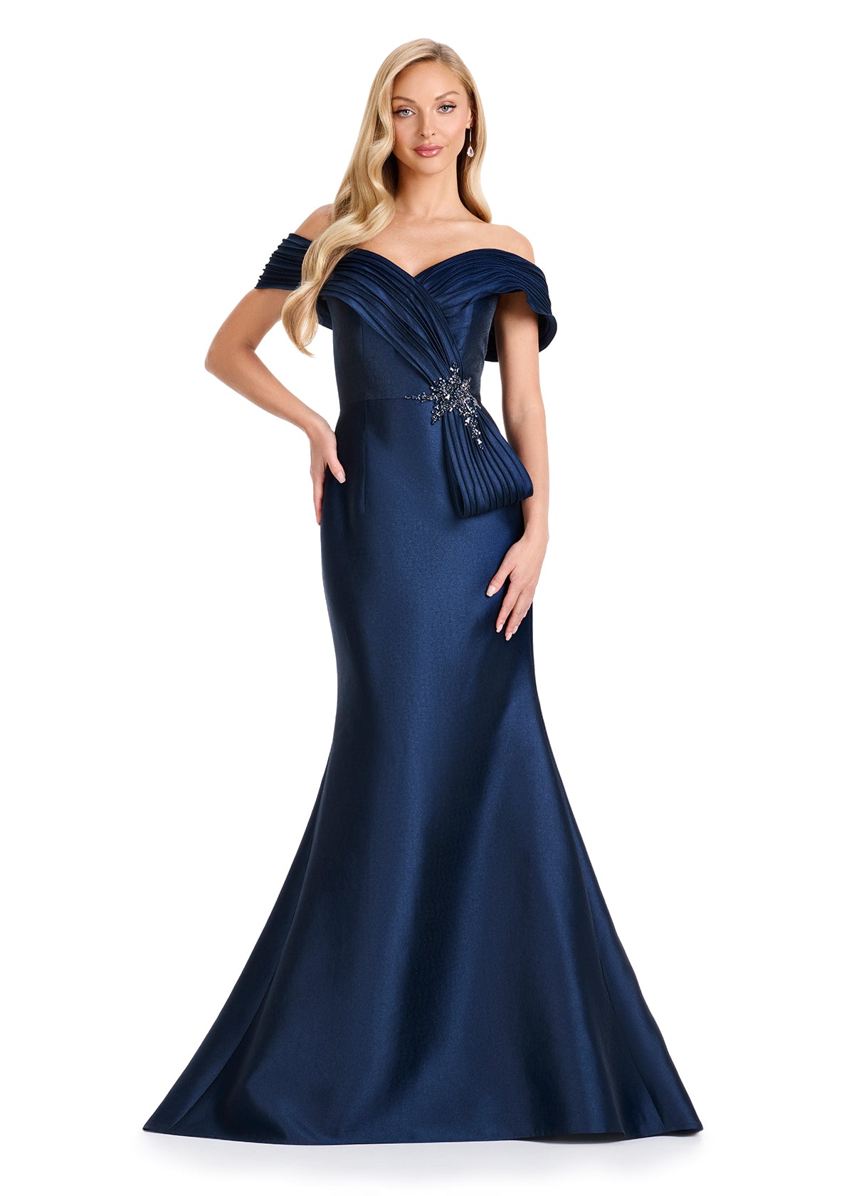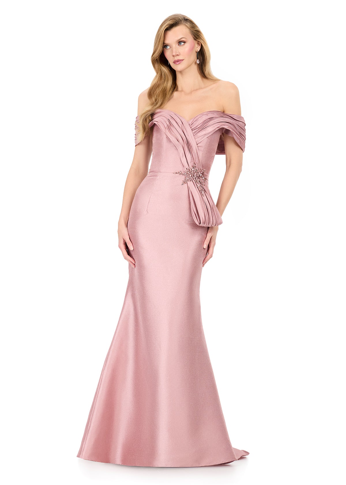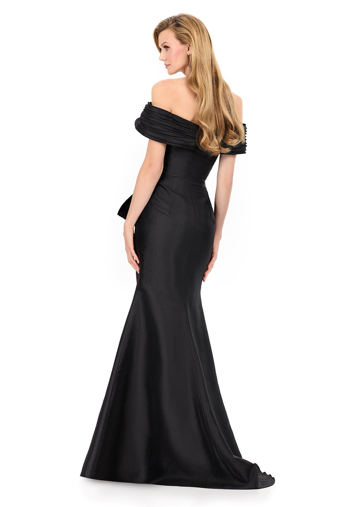 Ashley Lauren E12103 showcases an elegant off-the-shoulder neckline with softly layered pleating across the bodice. A beautifully detailed accent at the waist adds dimension while enhancing the figure. Designed with a sleek, floor-length silhouette, this refined dress offers timeless sophistication and graceful movement, making it ideal for formal occasions and special events.
