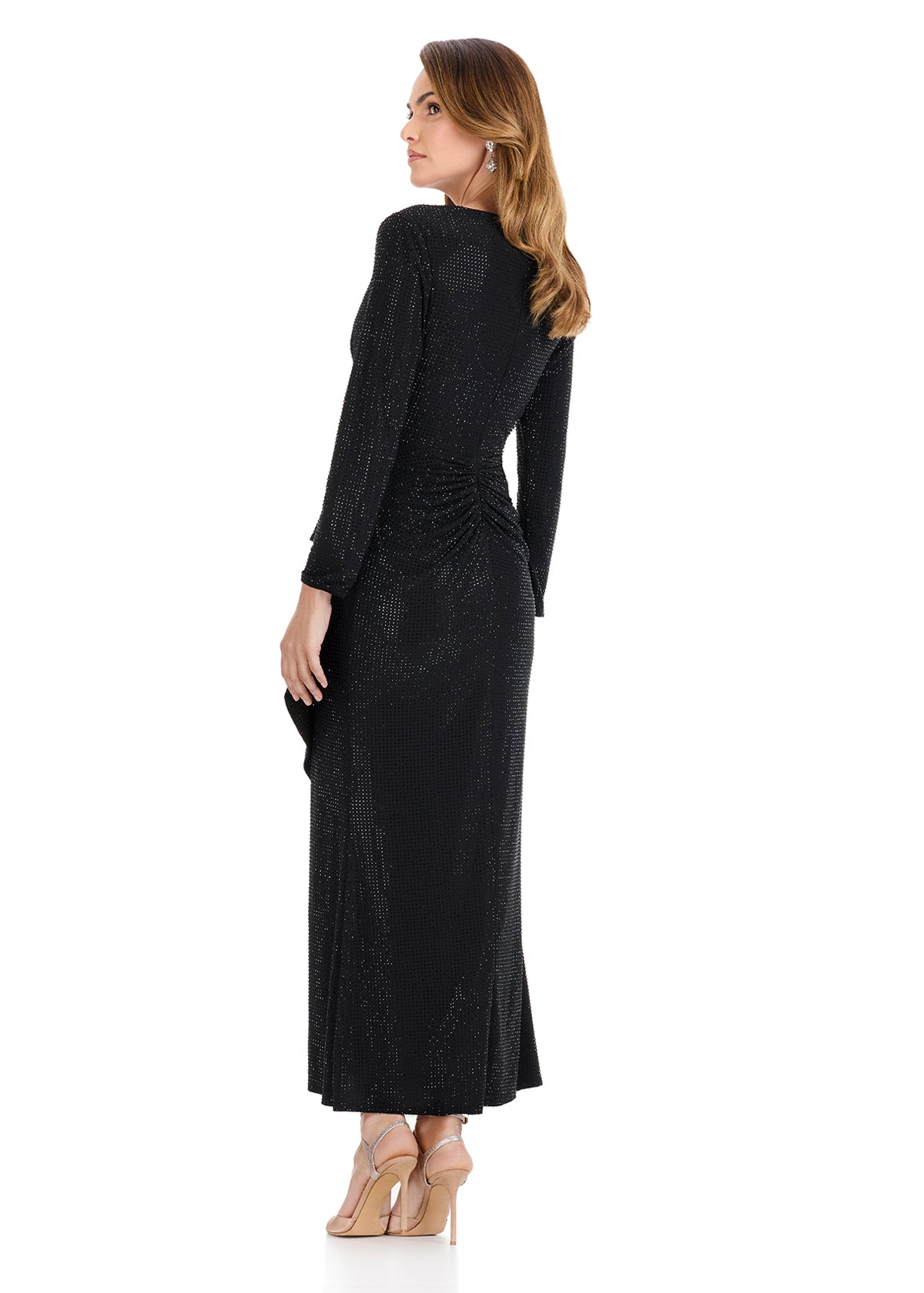 Ashley Lauren E4824 is an elegant long sleeve dress featuring a flattering V-neckline, subtle shimmer fabric, and a softly draped waist. Designed with a fitted silhouette and a side slit, this sophisticated dress is perfect for formal events.