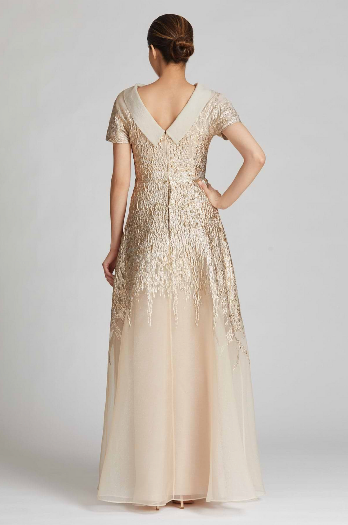 This classic organza jacquard gown is stunning. The metallic gold pattern draws an illusion to delicate appliques throughout the dress making it a perfect choice for the mother of the bride/groom, formals and charity events.