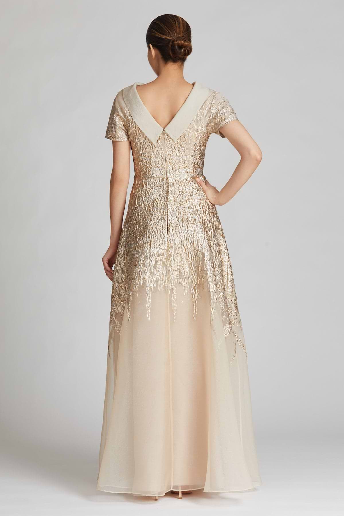 Teri Jon 207081 features a rolled boat neckline and classic cap sleeves. The metallic gold patterning throughout the bodice adds elegance while an A-line skirt made from organza jacquard provides comfort. This timeless dress is perfect for the mother of the bride/groom, formals, and charity events.