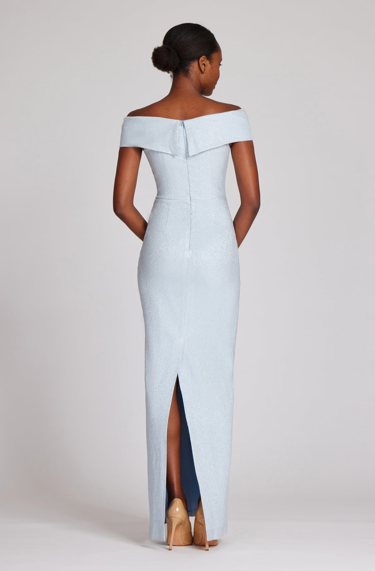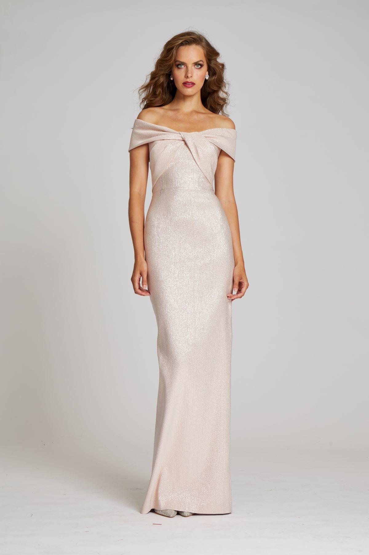 This beautiful metallic gown is both flattering and glamorous. The twisted off-the-shoulder neckline is an elegant update to the simple form fitting body and the seam at the waist provides a wonderful slimming effect. Perfect for the mother of the bride/groom, gala, or a black tie event.