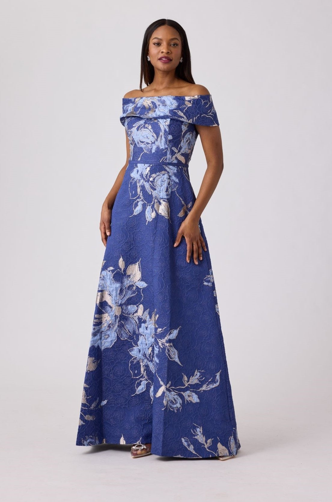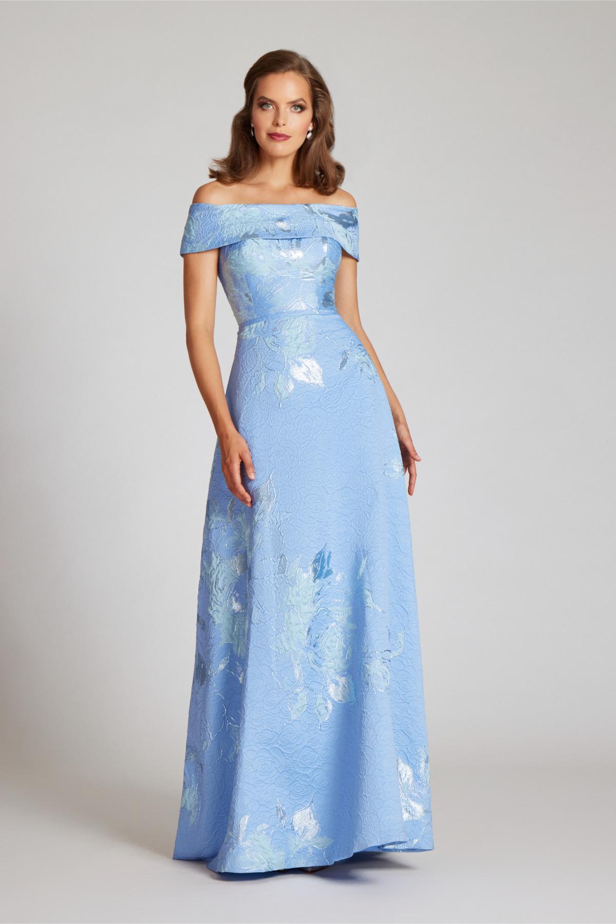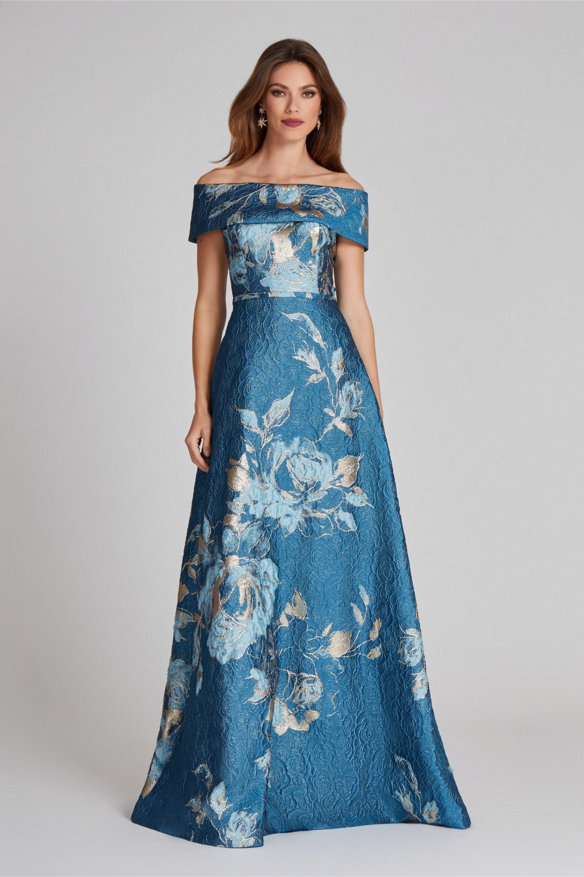 A stunning off-shoulder metallic floral gown perfect for the mother of the bride/groom or a summer evening party.