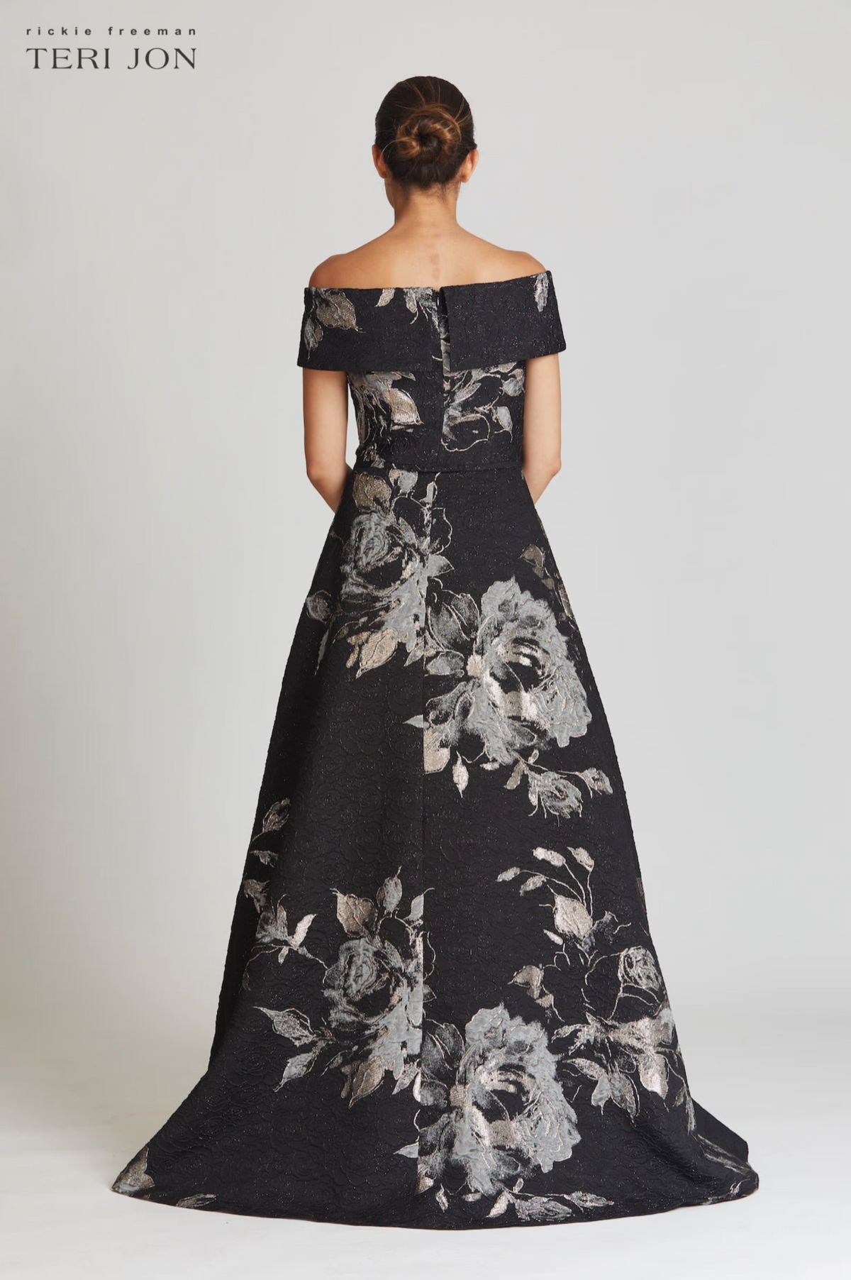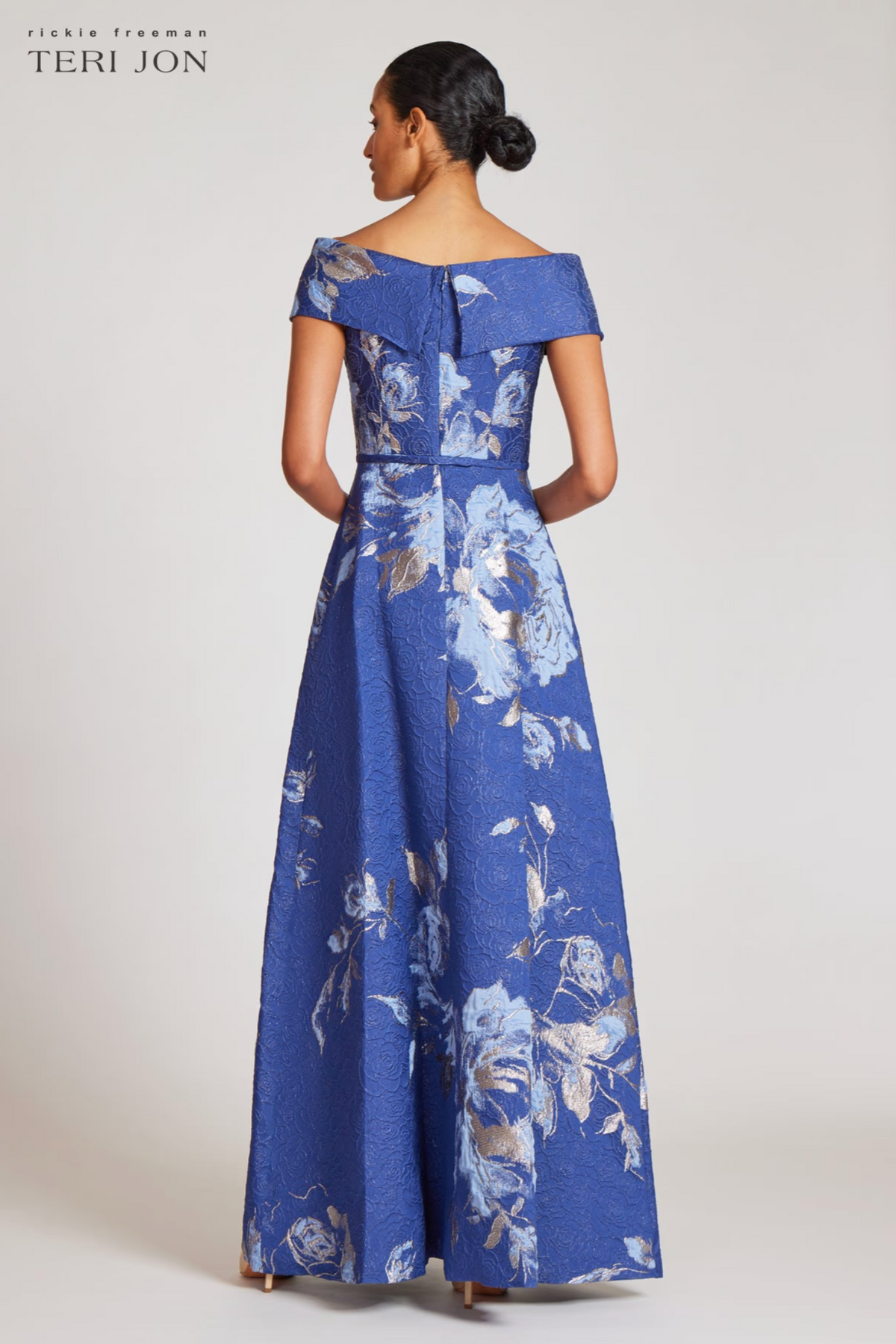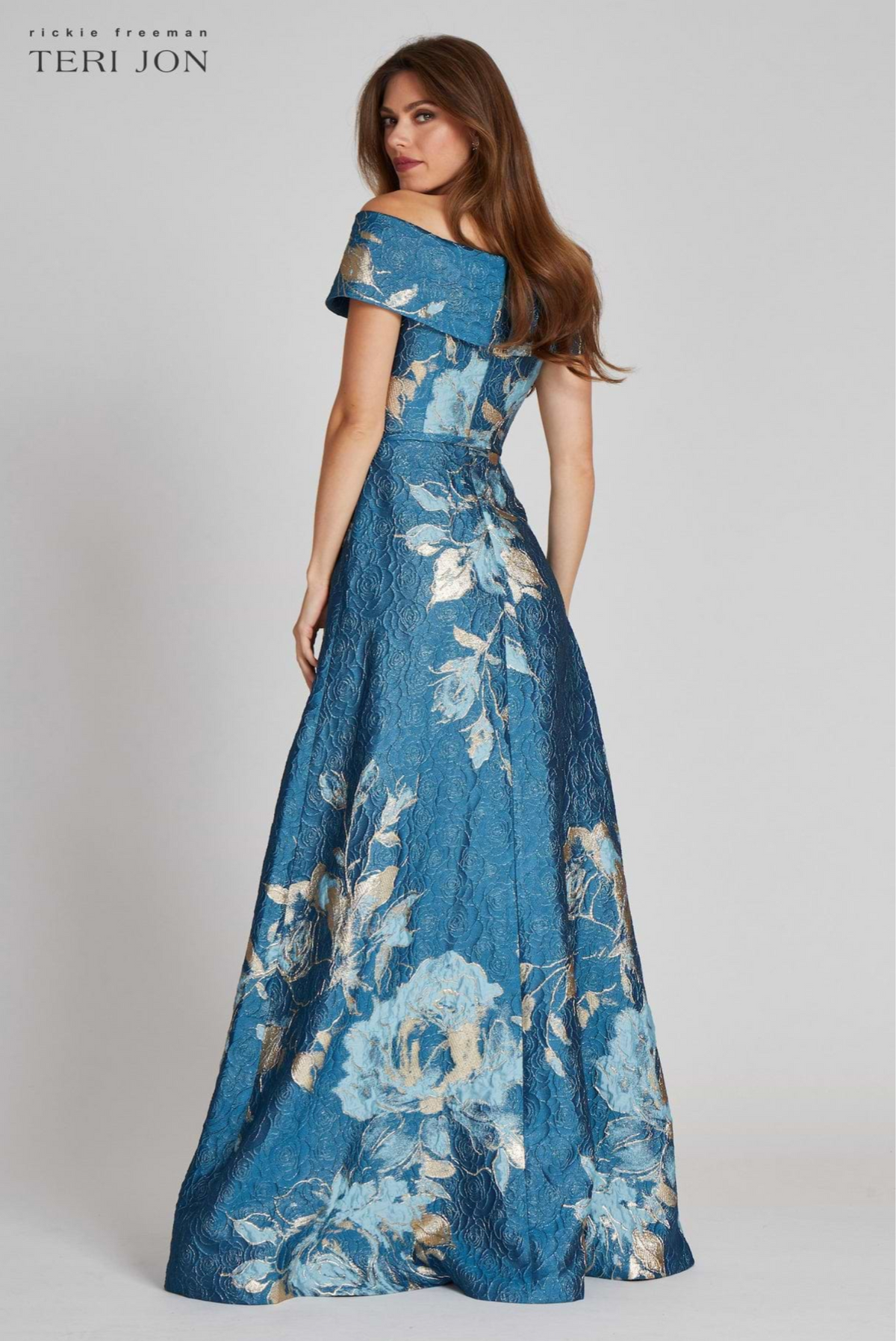 A stunning off-shoulder metallic floral gown perfect for the mother of the bride/groom or a summer evening party.
