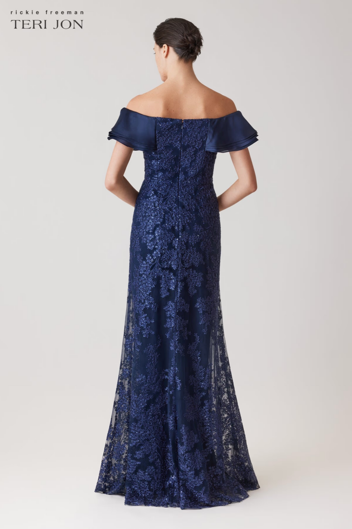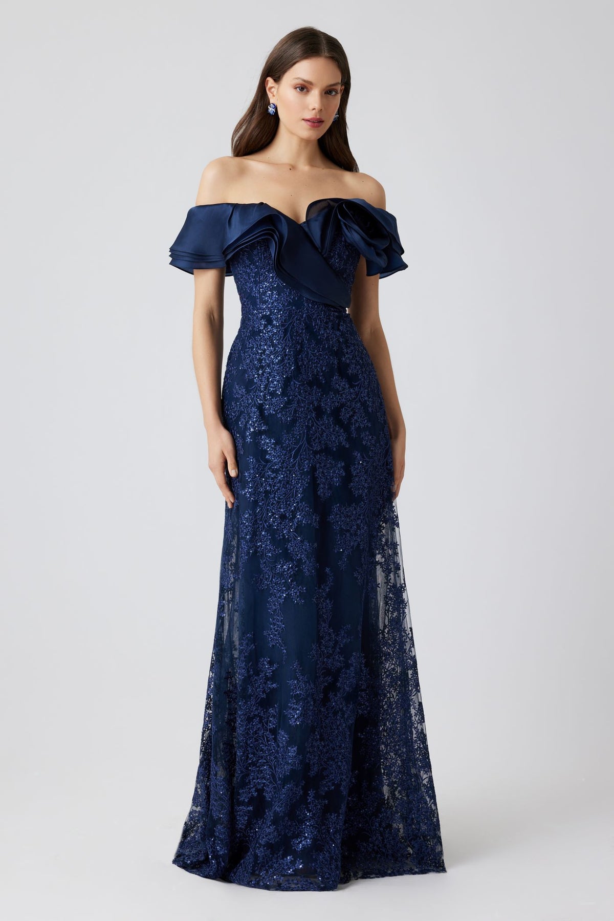 Designed in a rich navy hue, this organiza-tulle gown features an elegant off-the-shoulder ruffle neckline and a floor-length A-line silhouette. Sequin details throughout bring a subtle sparkle, perfect for formal events and evening affairs.