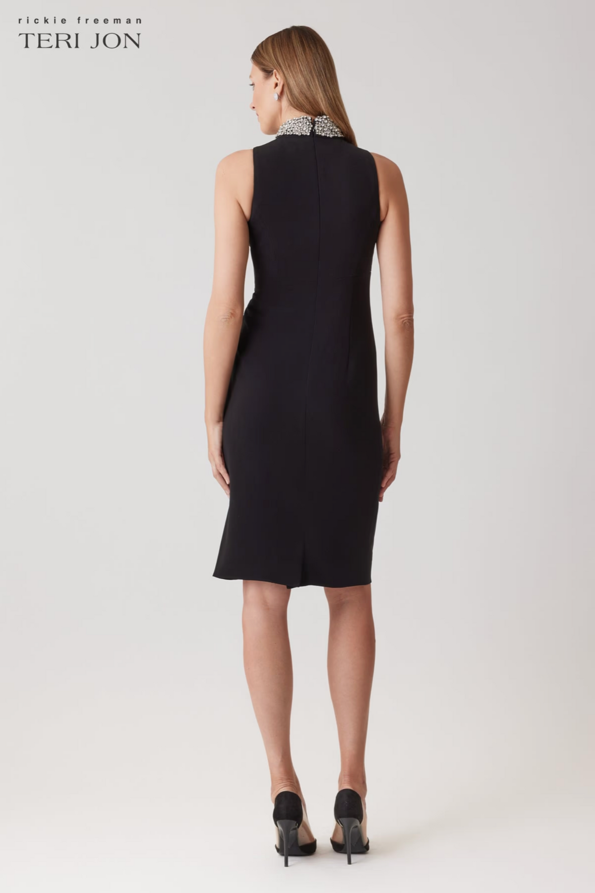 This elegant knee-length cocktail dress features a striking high neckline adorned with shimmering pearl embellishments. The sleeveless silhouette is sleek and timeless, while the subtle side ruching enhances the waistline with graceful detail. Crafted in a rich black fabric, this dress is perfect for evening soirées or weddings.
