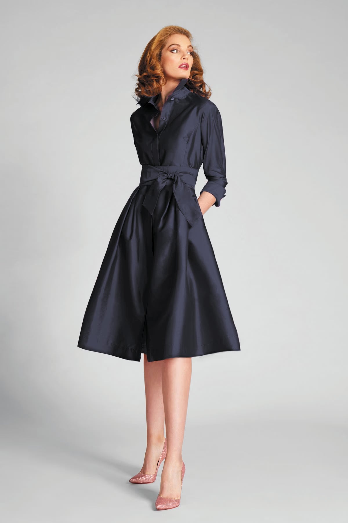 This taffeta shirt dress represents a refined approach to formal dressing. Constructed with precision, the garment features elbow sleeves and a tea-length cut that delivers both coverage and sophistication. The structured taffeta fabric maintains its shape throughout the evening, while strategically placed pleats in the skirt provide subtle movement without compromising the polished silhouette. The removable sash belt offers styling versatility, wear it for definition or omit it for a streamlined aesthetic. A thoughtfully designed piece that transcends seasonal trends, this dress serves as a foundational investment for your formal occasions.