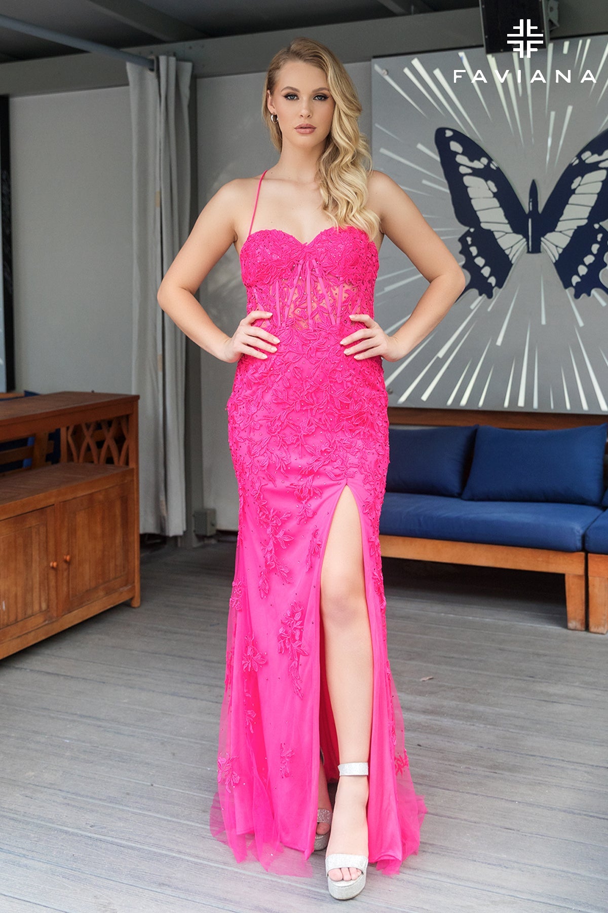 Long Tulle & Lace Sweetheart Dress Featuring A Corset Bodice With Dropped Center Front Waist, A Front Slit With A Lace-Up Back And An Invisible Zipper With Hook & Eye Closure
