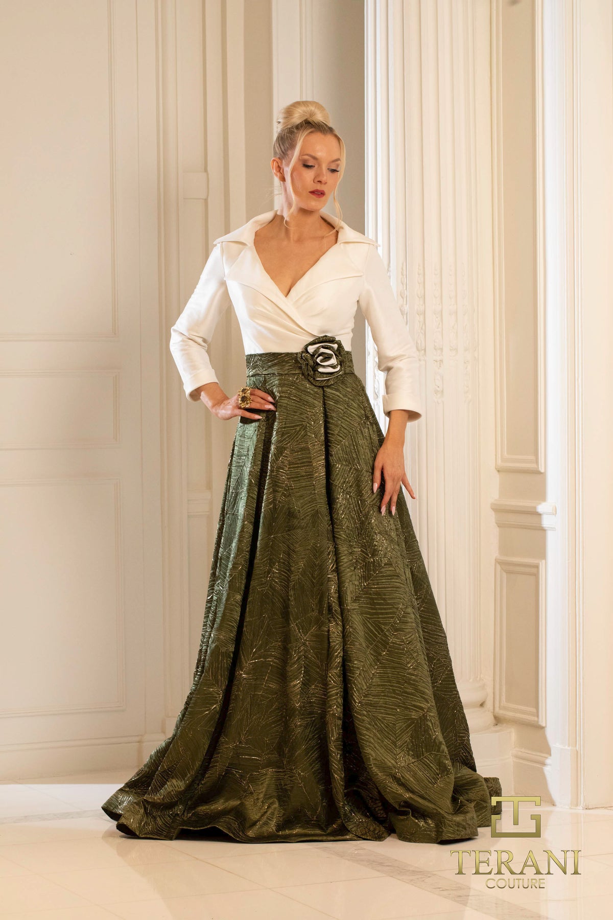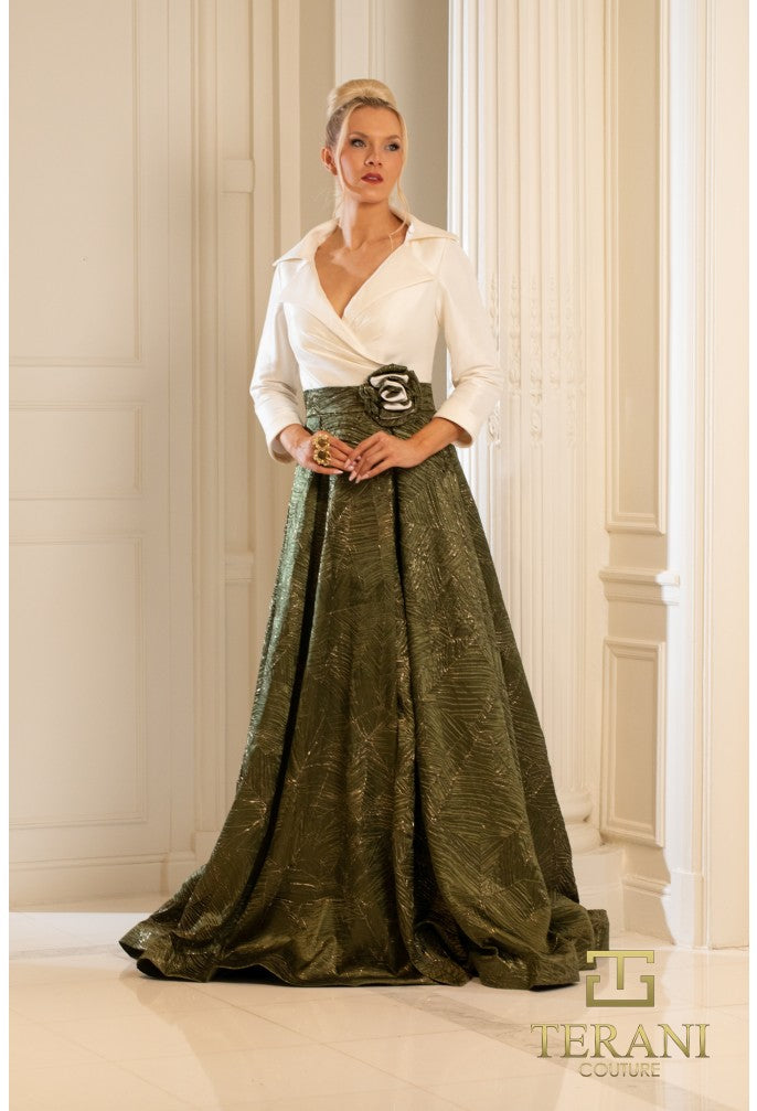 Terani 252M5522 features a structured V-neckline with a collar and three-quarter sleeves for a timeless look. The fitted waist is embellished with a two-toned rosette before flowing into a metallic A-line skirt. Combining modern sophistication with classic femininity, this formal dress is perfect for weddings and evening celebrations.