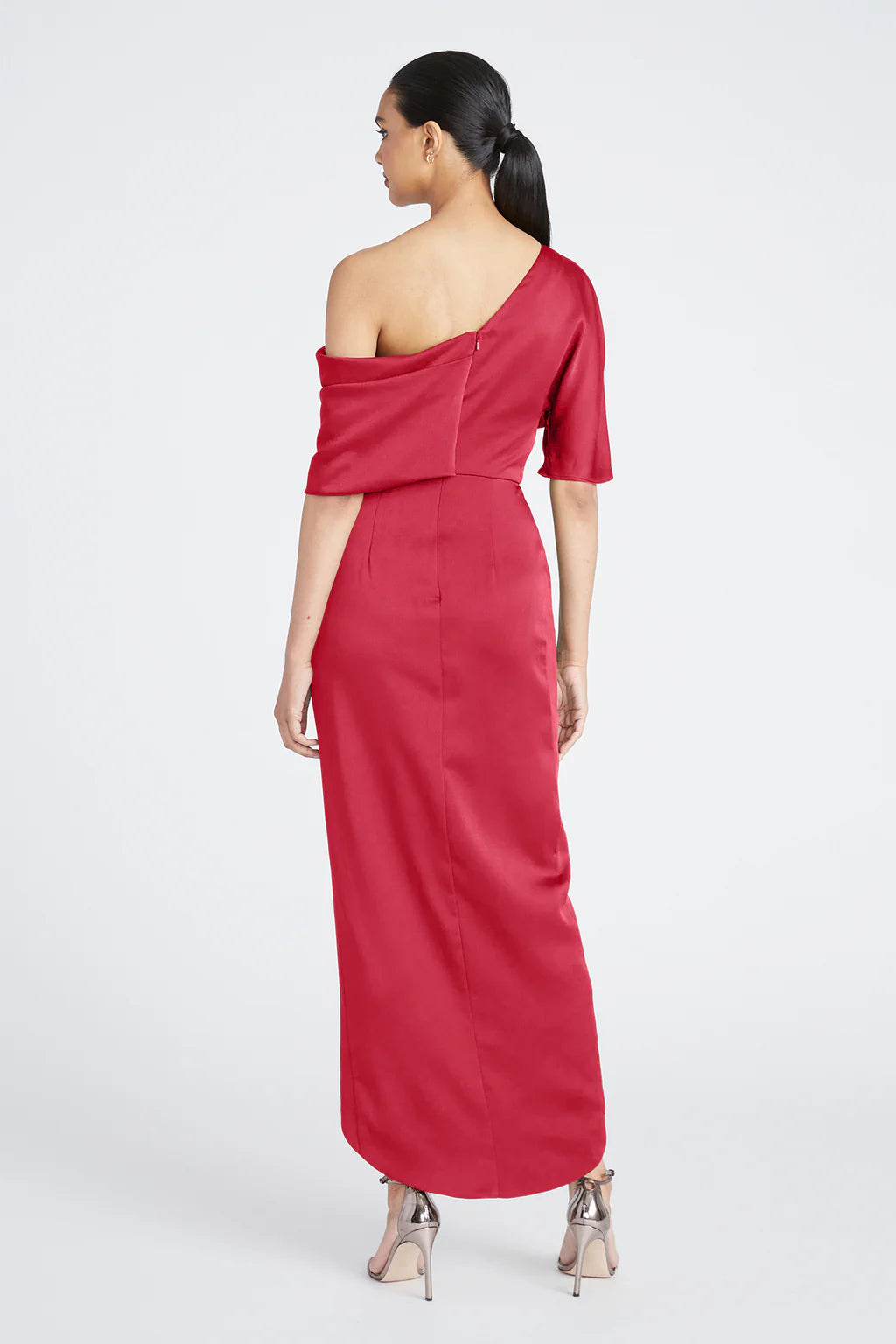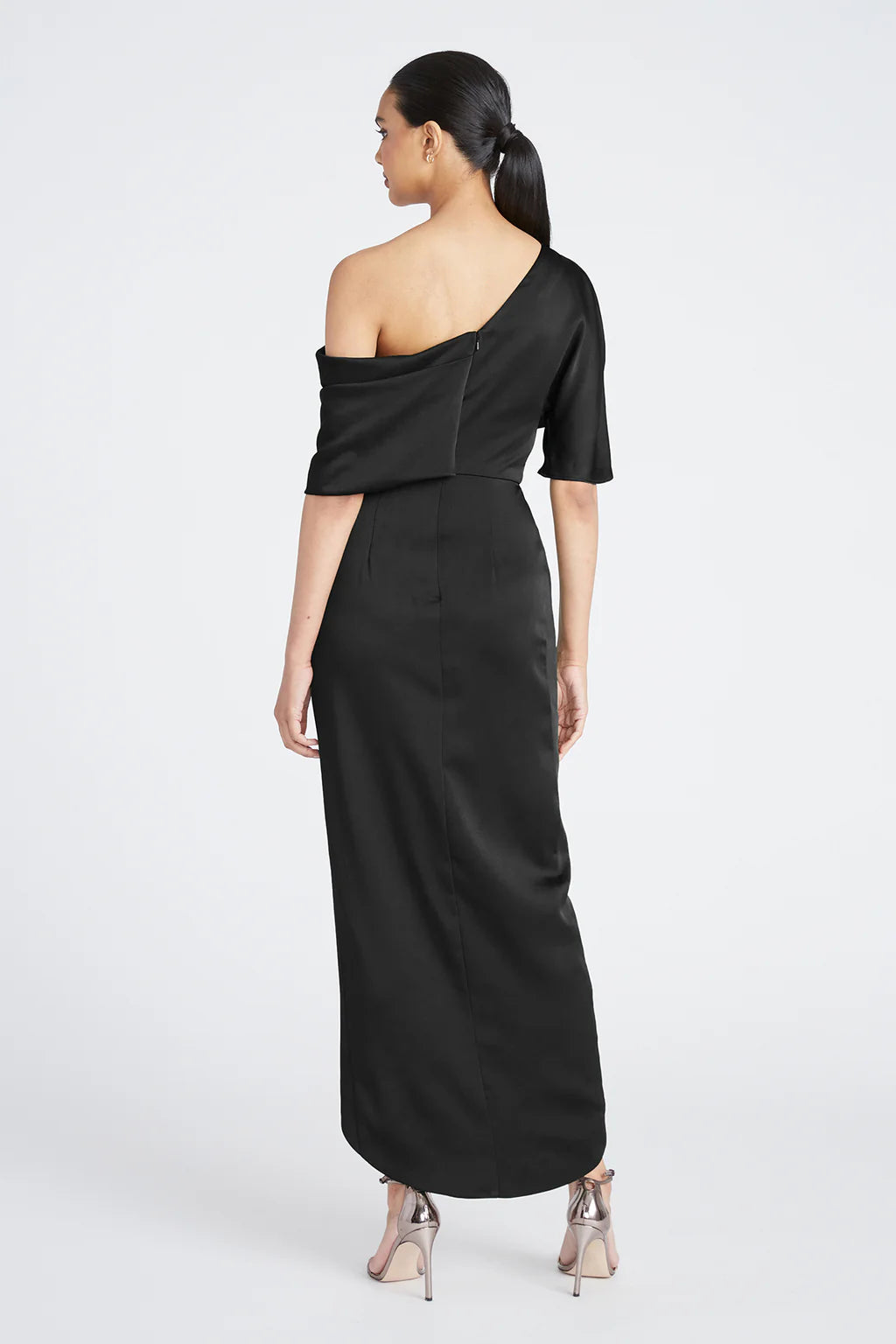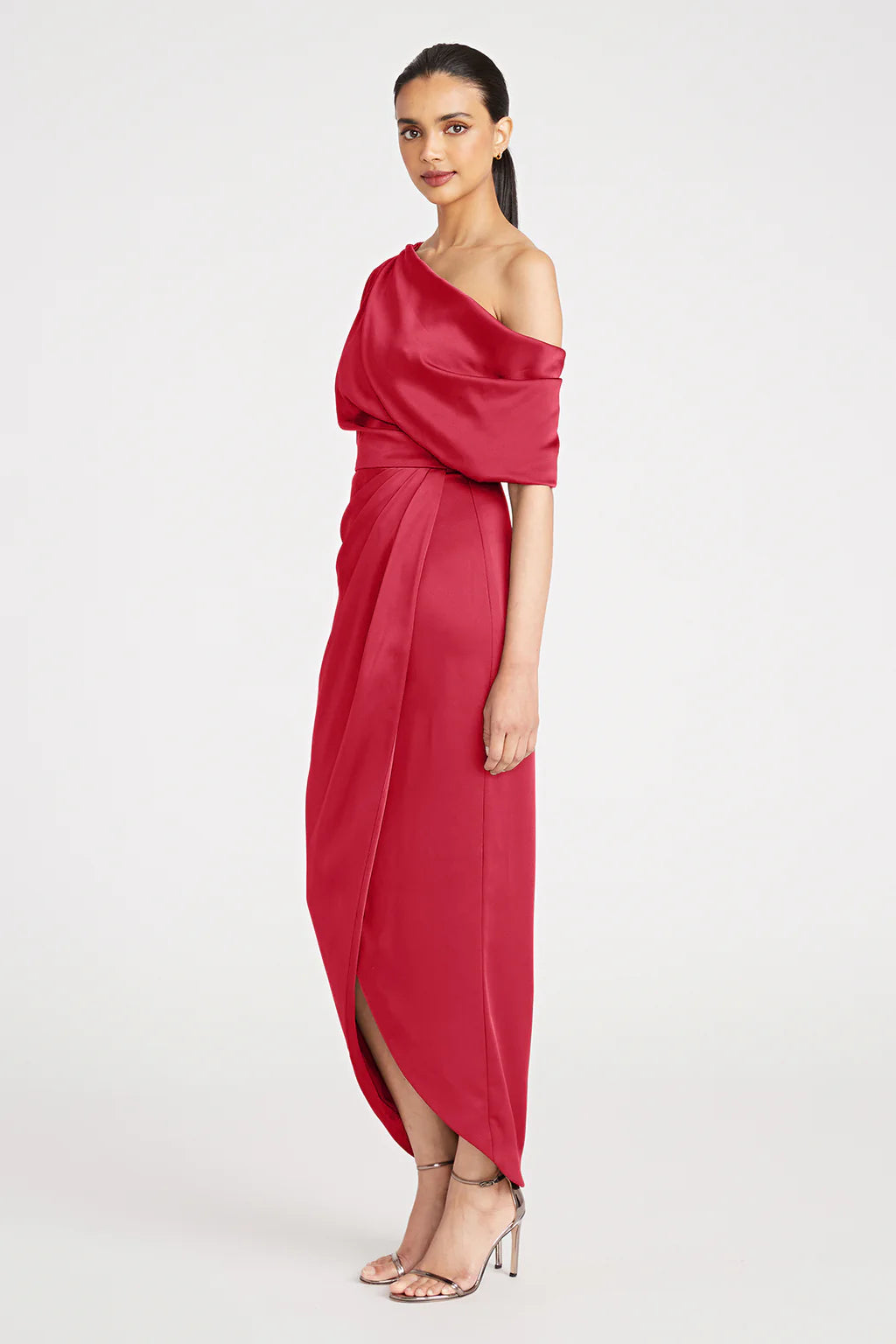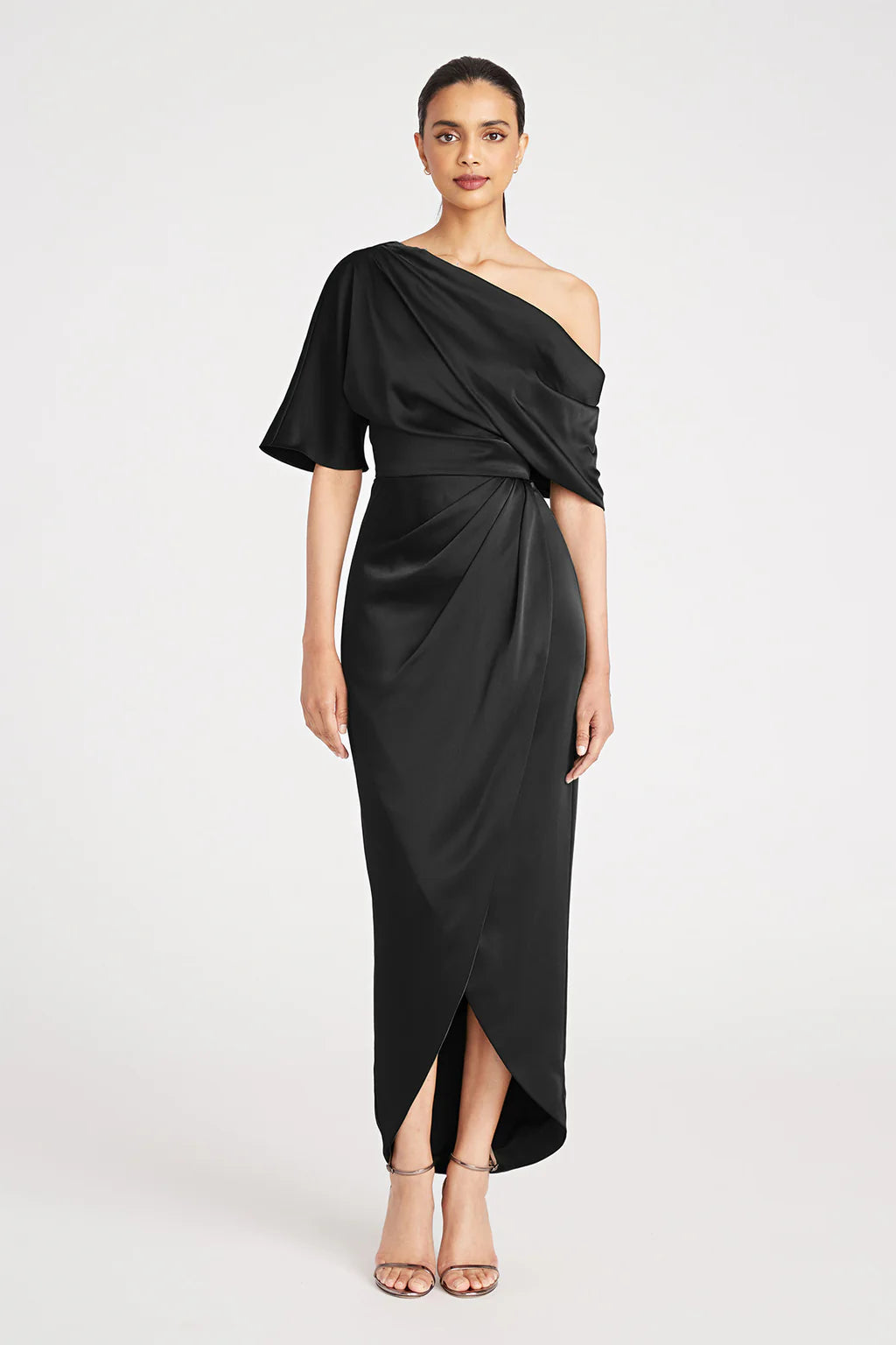 The Rayna Gown is crafted with smooth satin for a minimalistic and timeless look. It features an asymmetrical neckline, elegant one-sleeve detail, and faux wrap skirt.