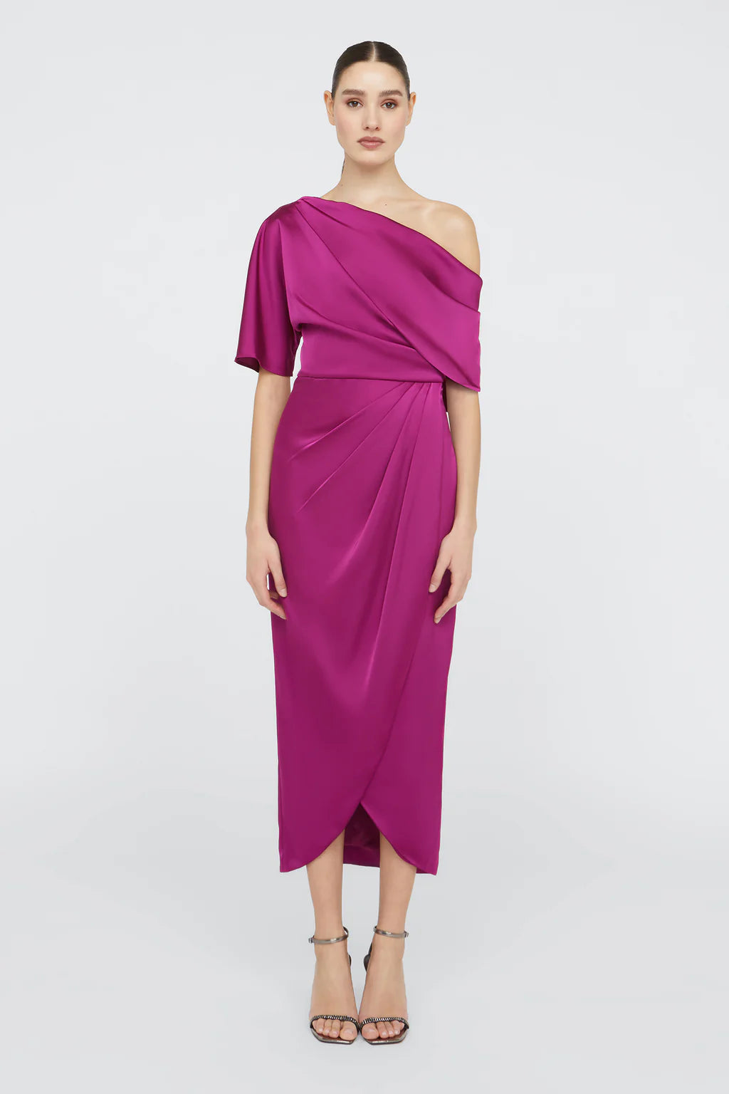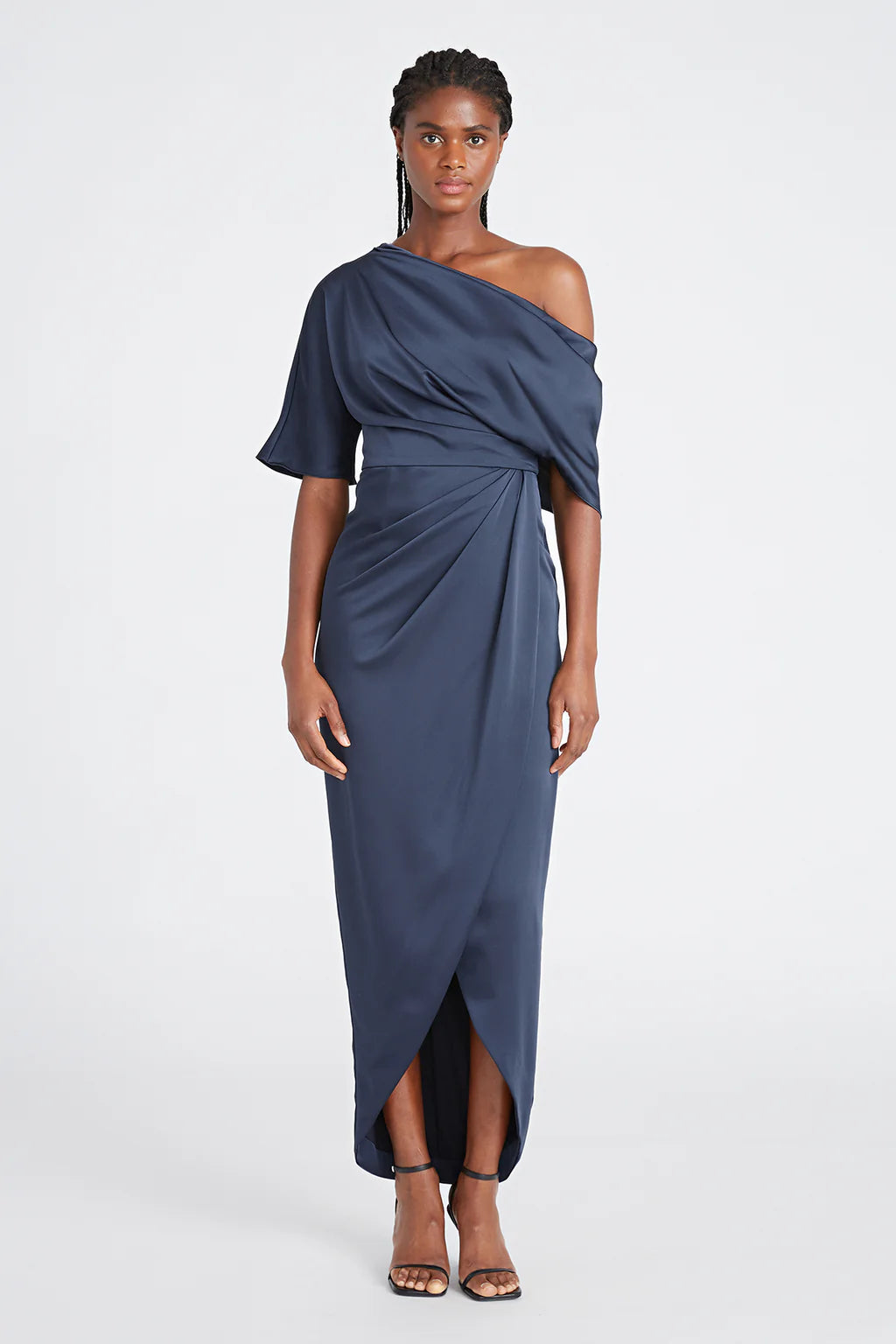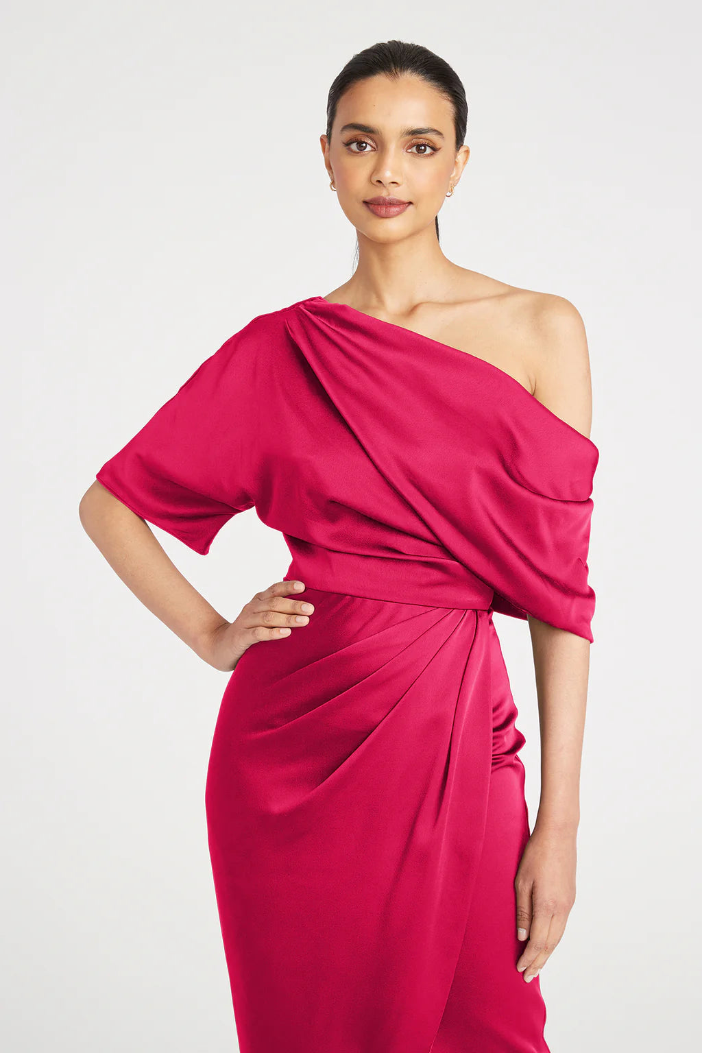 The Rayna Gown is crafted with smooth satin for a minimalistic and timeless look. It features an asymmetrical neckline, elegant one-sleeve detail, and faux wrap skirt.