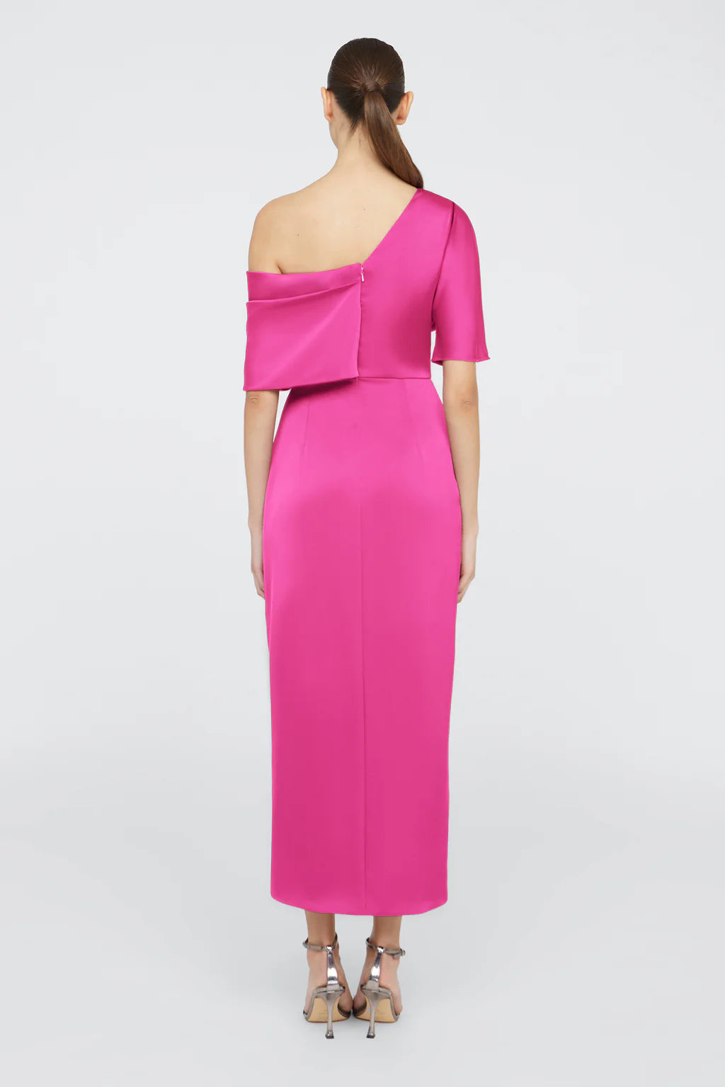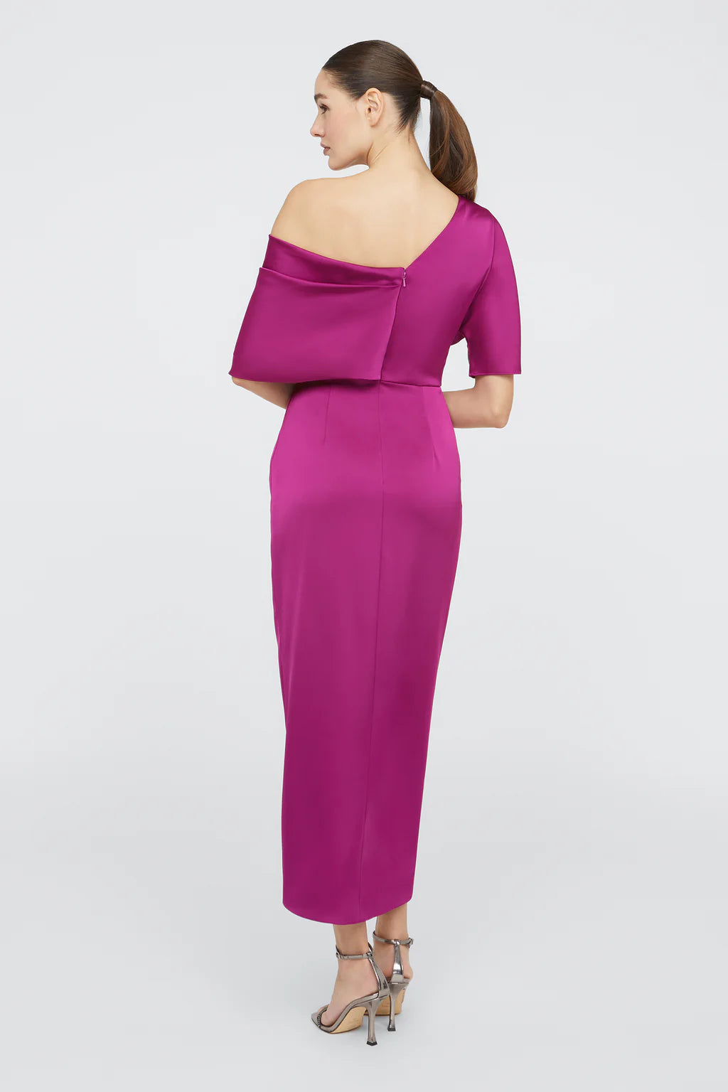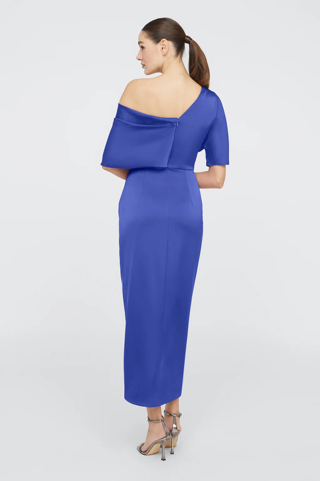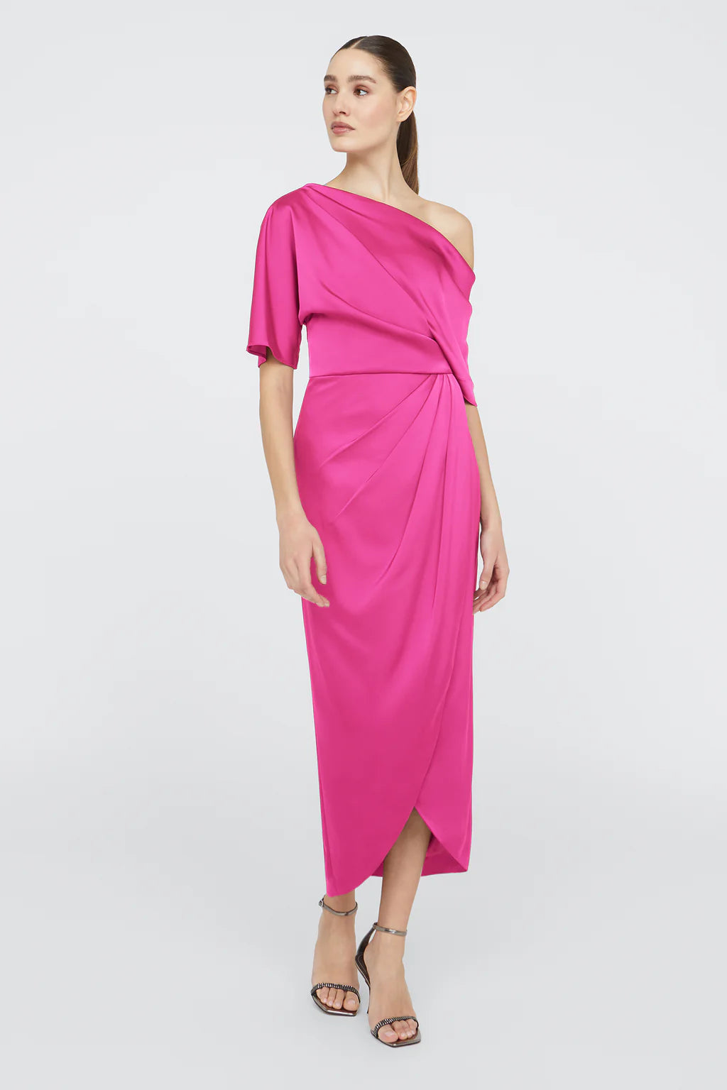 The Rayna Gown is crafted with smooth satin for a minimalistic and timeless look. It features an asymmetrical neckline, elegant one-sleeve detail, and faux wrap skirt.