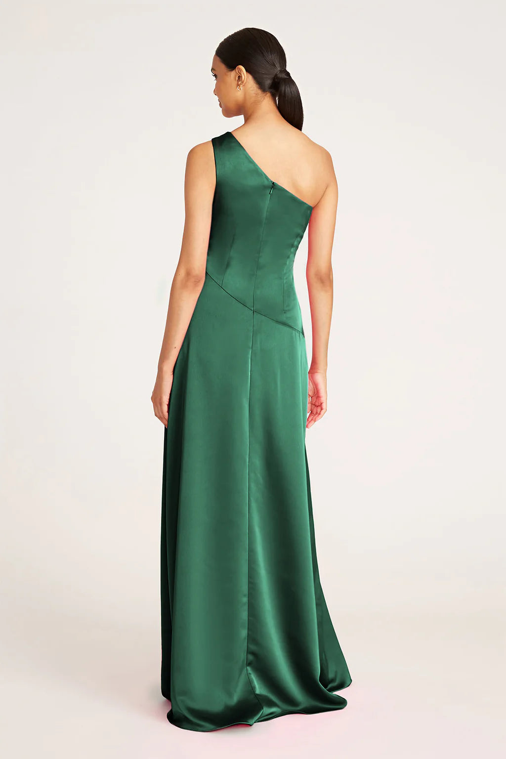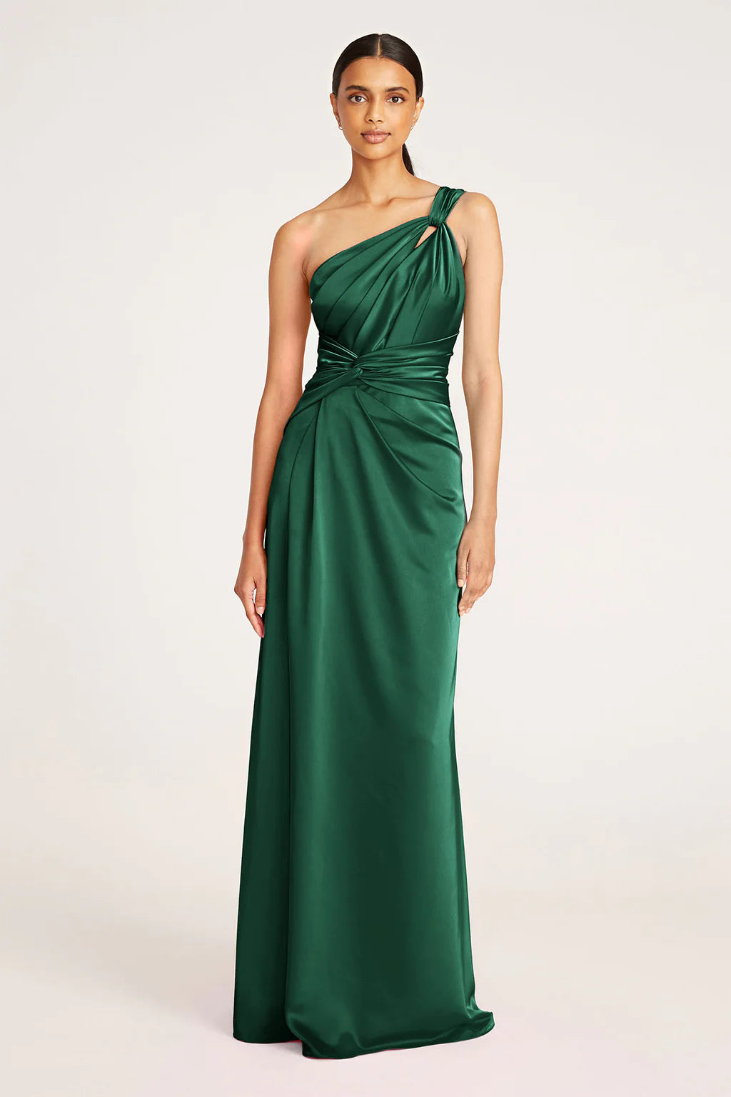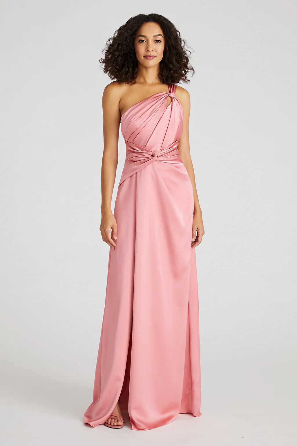 The Gloria Gown exudes elegance in sleek satin, showcasing a draped bodice and delicate twist details. The look captures a seamless balance of modern sophistication and timeless grace with its A-line silhouette.