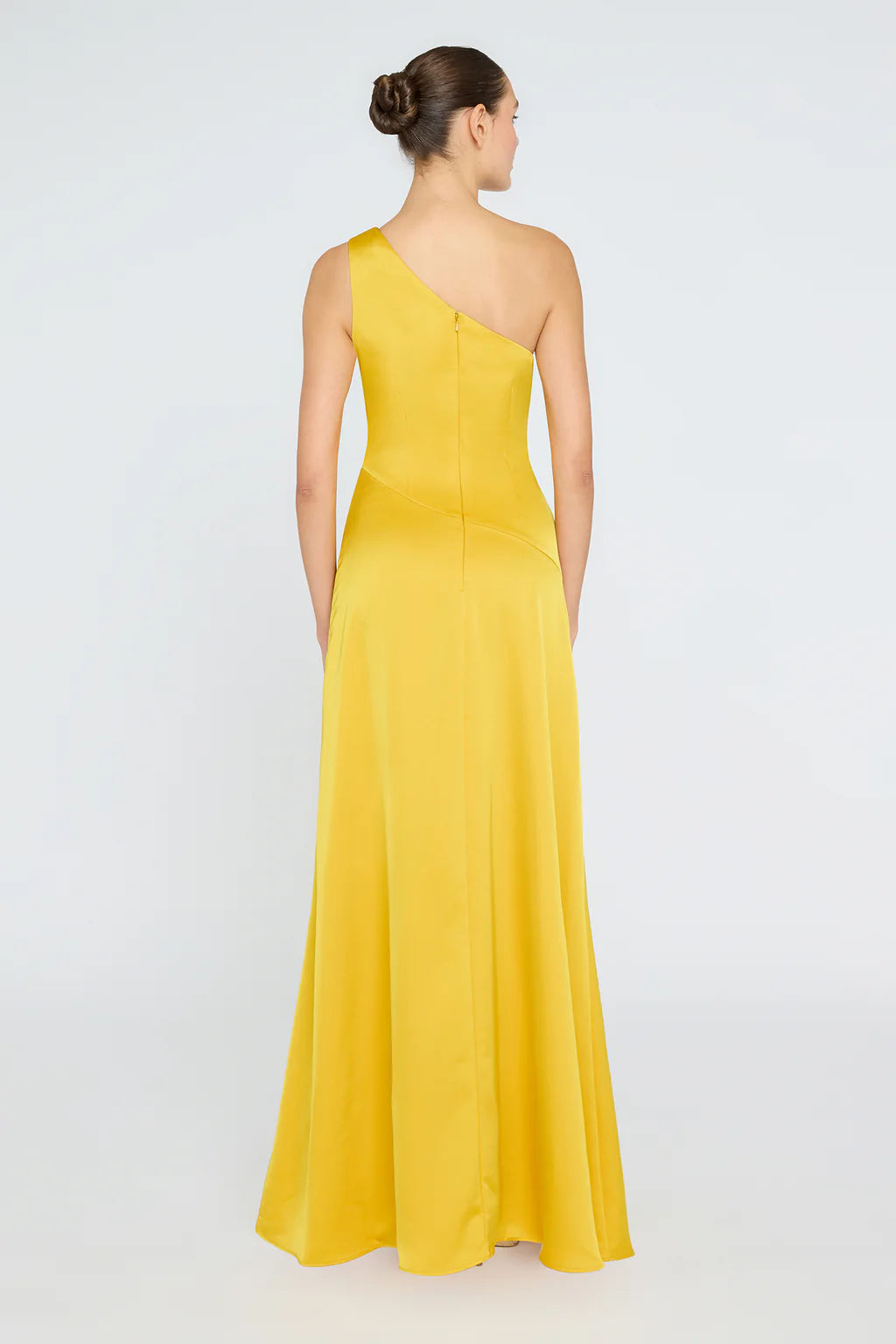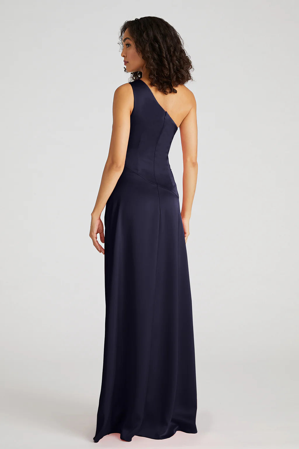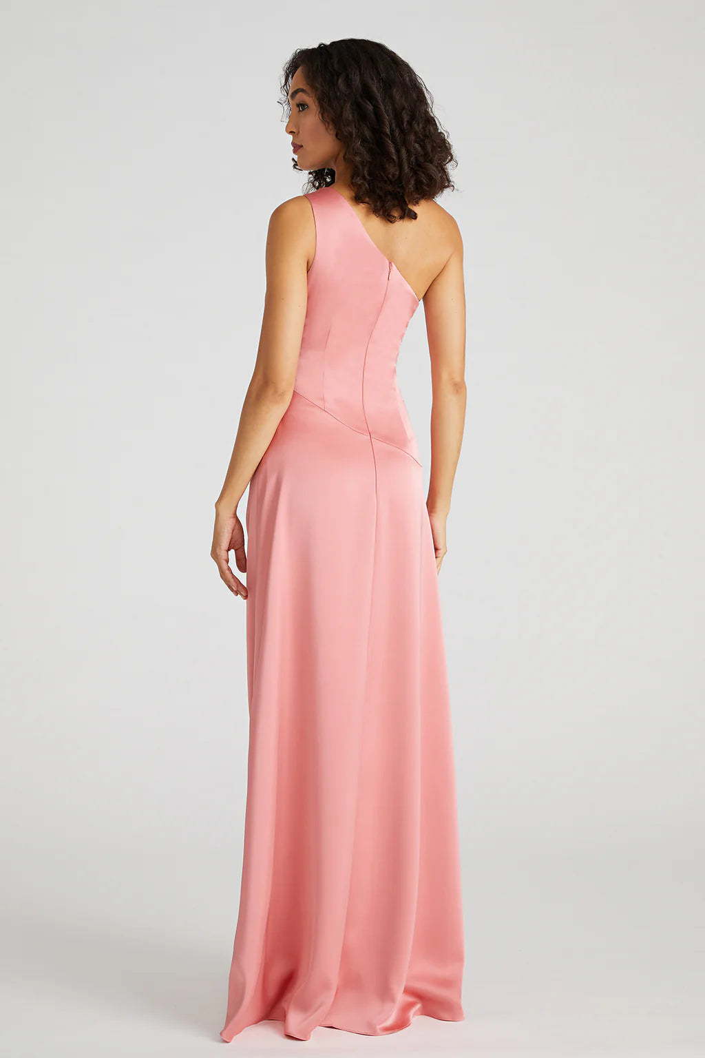 The Gloria Gown exudes elegance in sleek satin, showcasing a draped bodice and delicate twist details. The look captures a seamless balance of modern sophistication and timeless grace with its A-line silhouette.