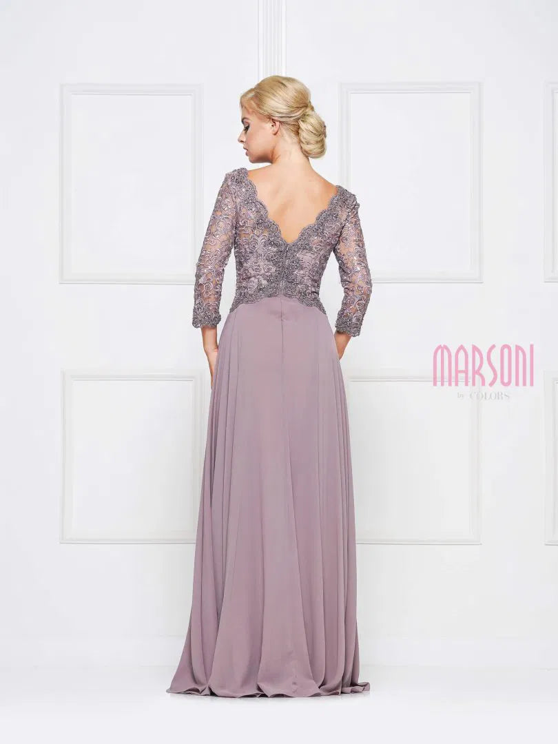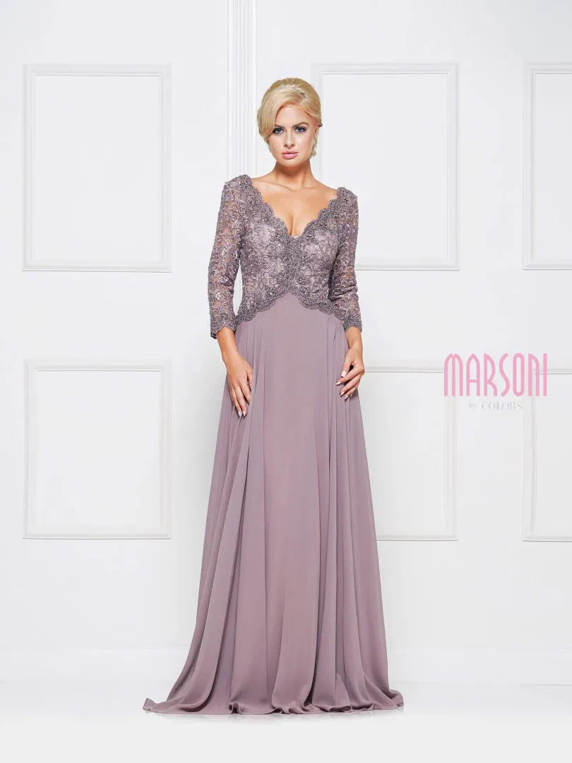 Marsoni M225 features a scalloped V-neckline with a fitted lace bodice adorned in intricate embroidery for a romantic look. A flowing chiffon A-line skirt adds graceful movement and comfort. Perfect for formal weddings and sophisticated evening events.