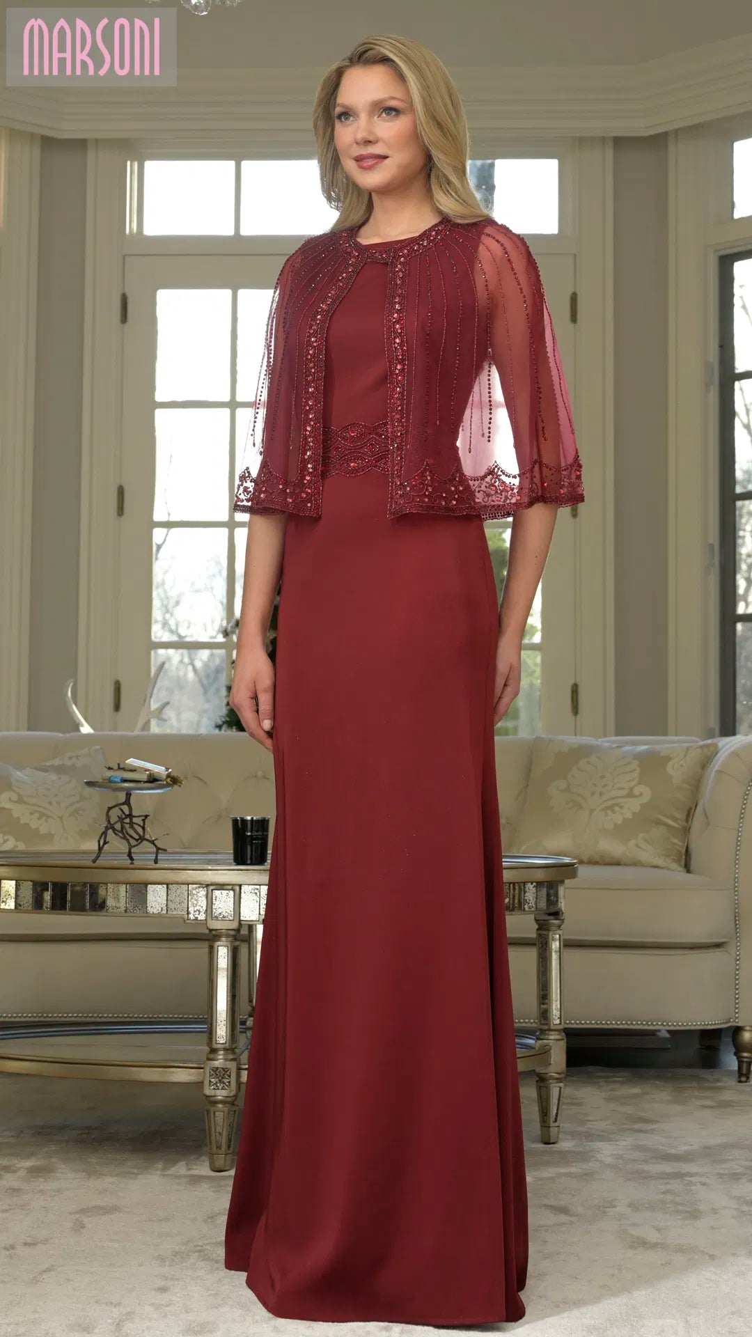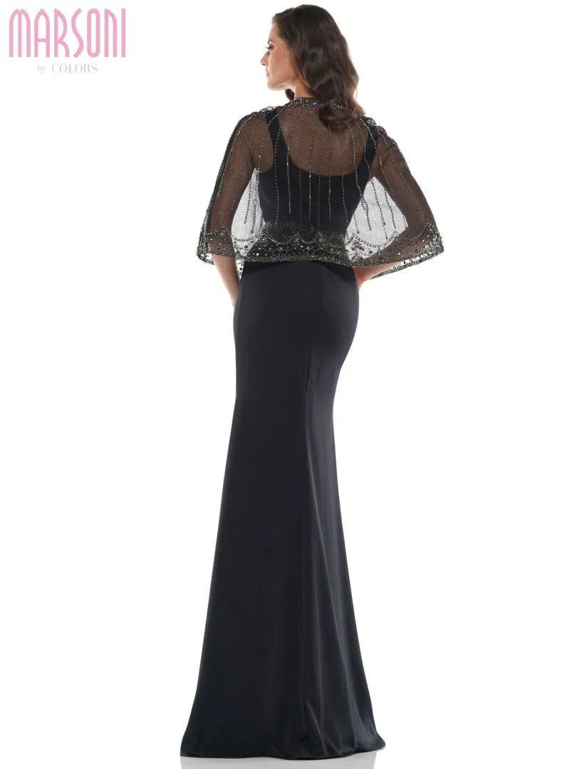 Marsoni M232 features a high neckline with a sleek fitted bodice and sheer beaded capelet overlay for a sophisticated look. A floor-length column skirt creates a streamlined silhouette that elongates the figure. Perfect for formal weddings or evening galas.
