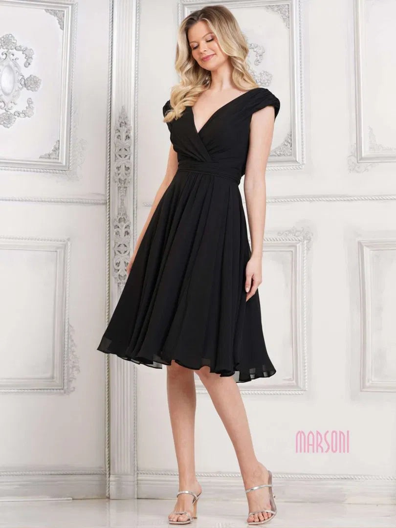 Marsoni M251 features a V-neckline with a softly ruched surplice bodice in flowing chiffon for a timeless look. A tea-length A-line skirt adds graceful movement and comfort. Perfect for special celebrations.